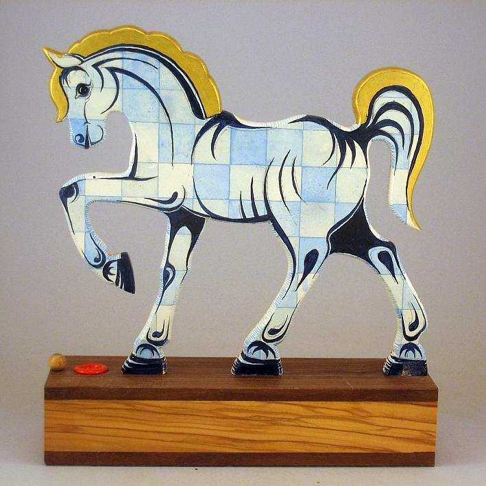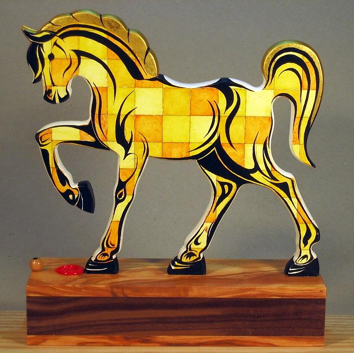 Le opere di questa linea sono realizzate completamente in legno con lavorazione manuale, i cavallini sono posti su una base realizzata con legni pregiati avente la funzione di scatola porta gioie.