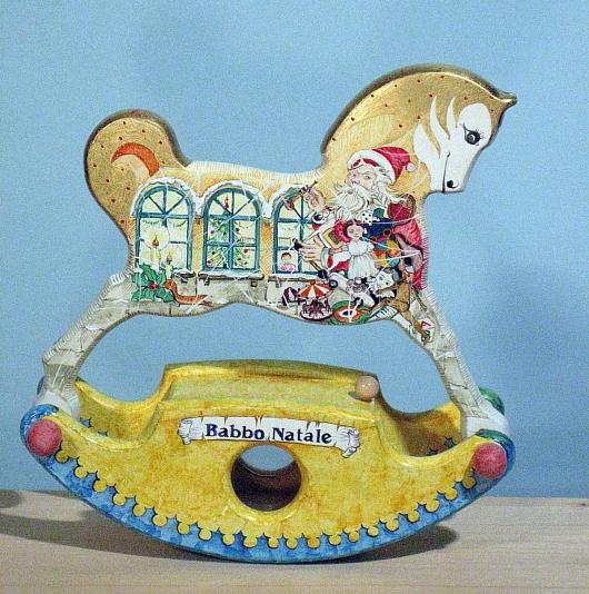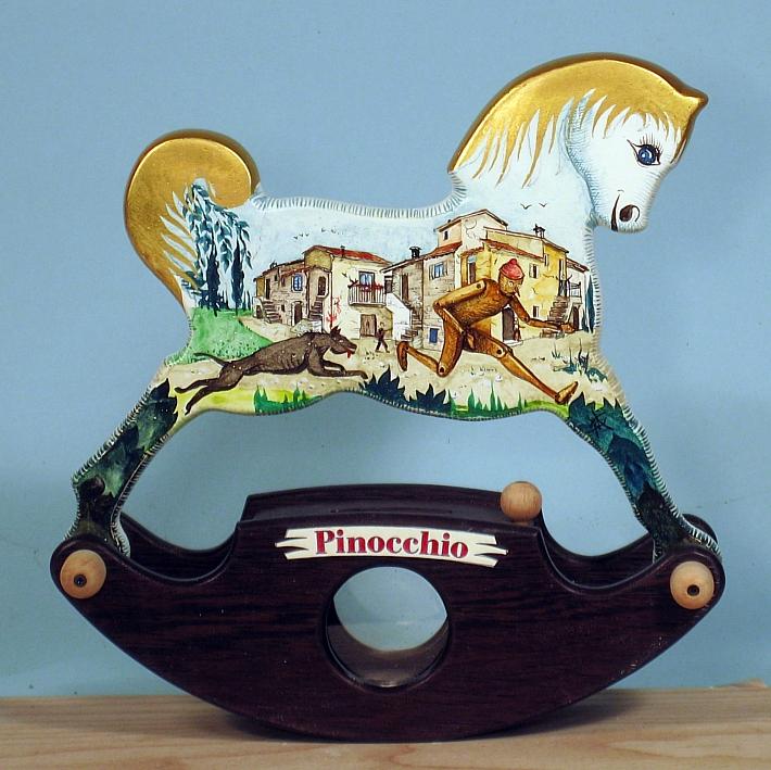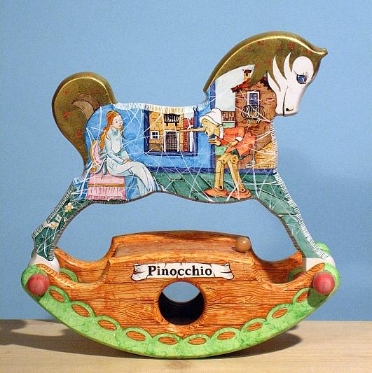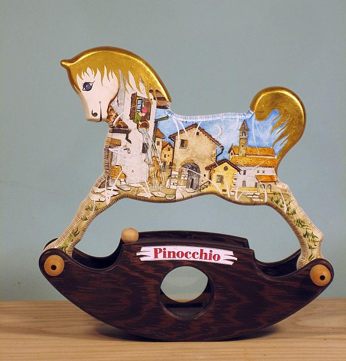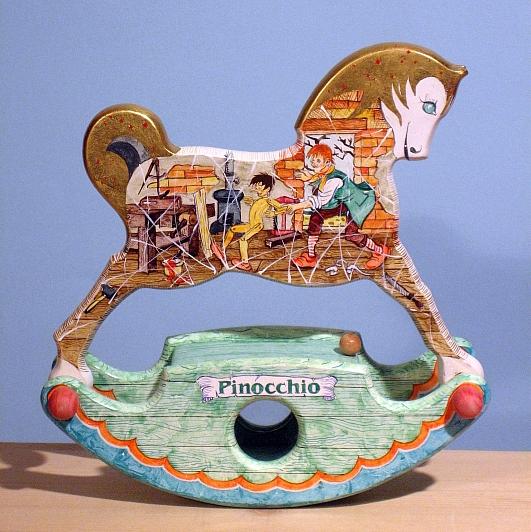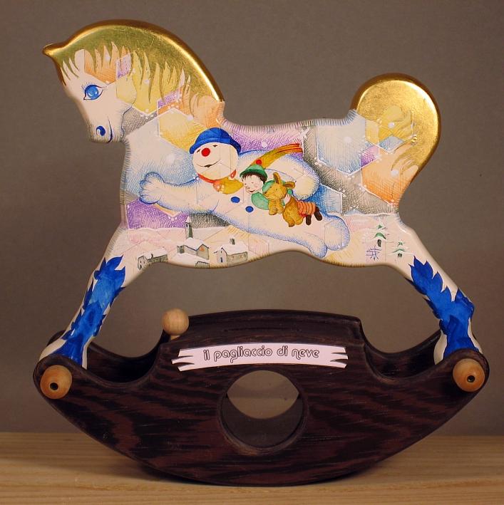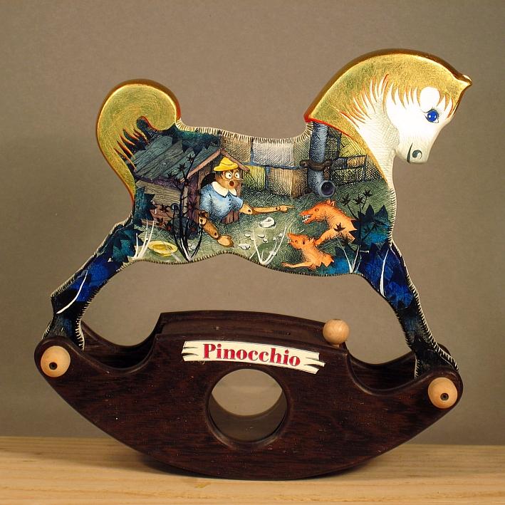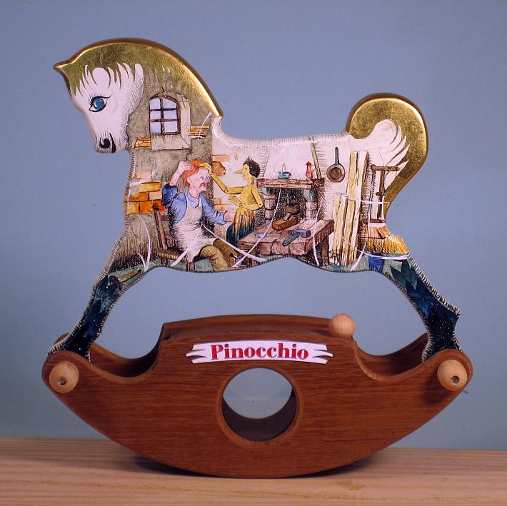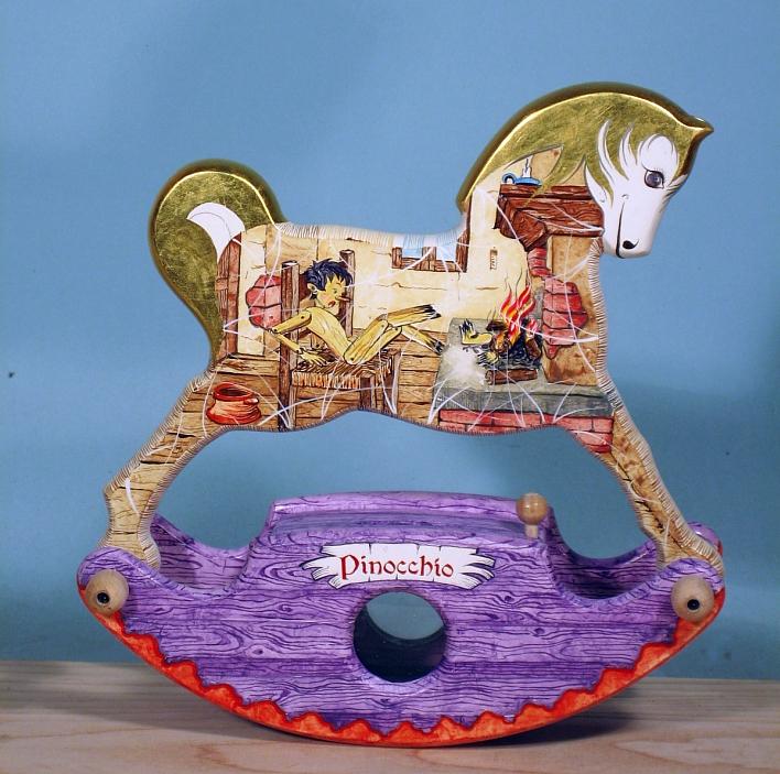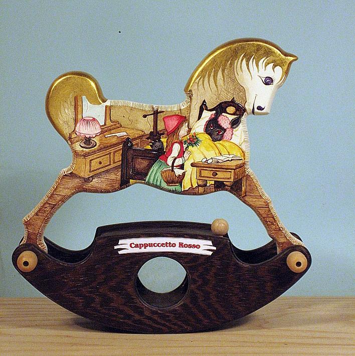 The so-called "Salvadanaio" collection represents unique pieces finely crafted with precious woods, the dedicated decorative theme is, "the fables", represented with different images one on each side, painted in watercolor with mane and tail covered with twenty-two gold leaf carats; Each work is unique numbered, cataloged and signed on a certificate of authenticity.