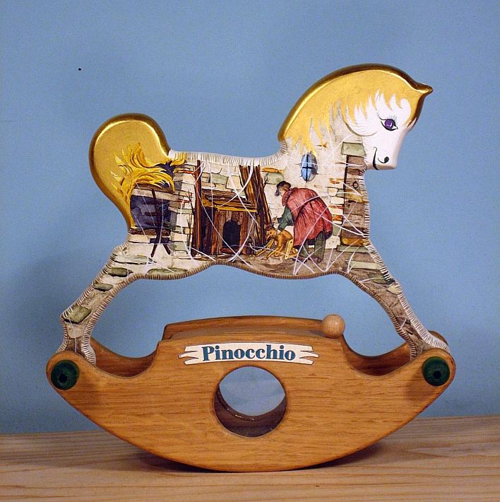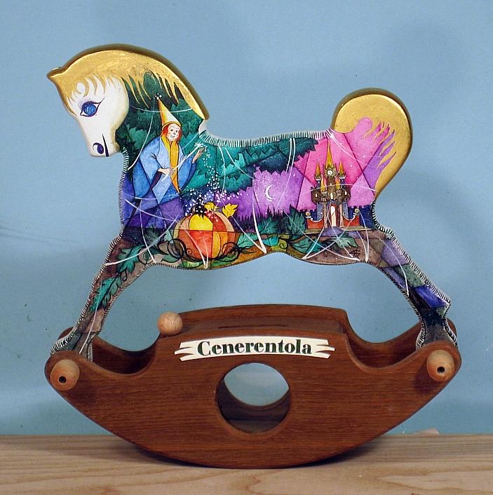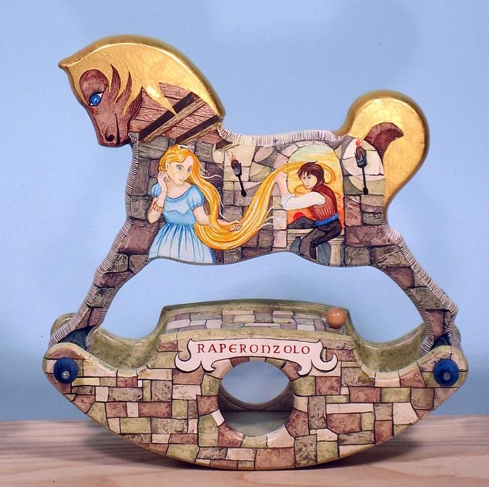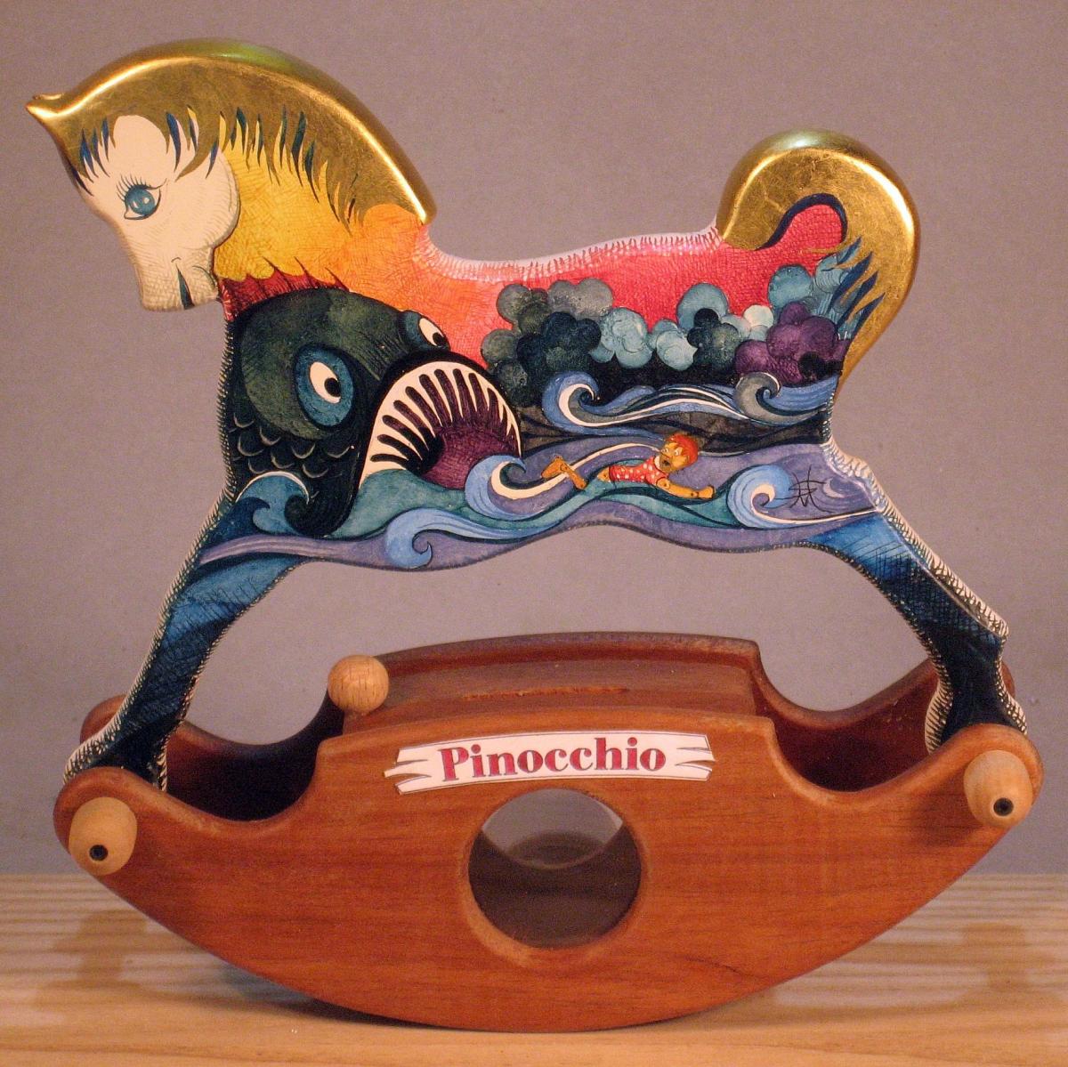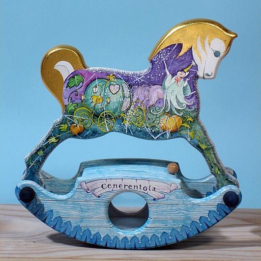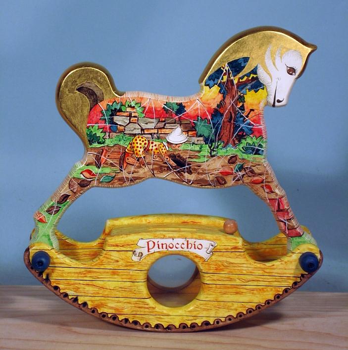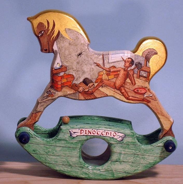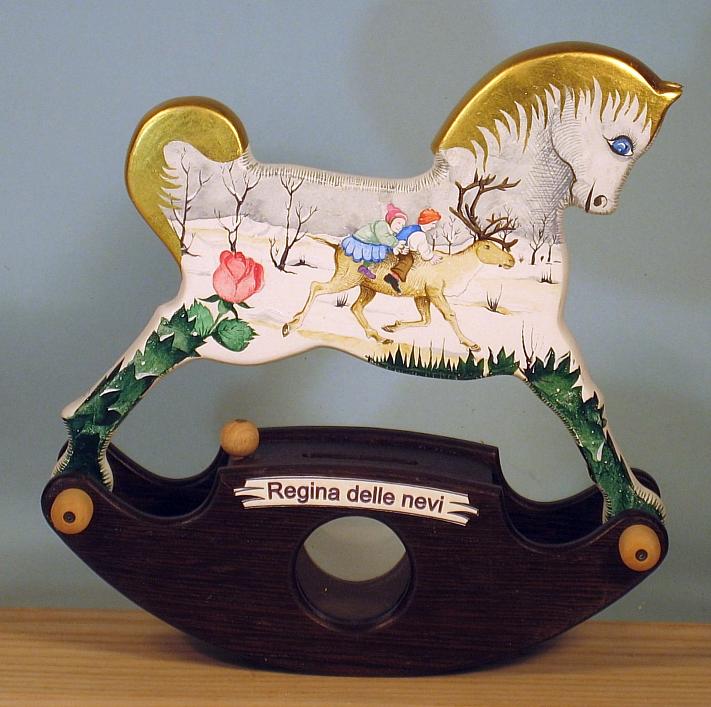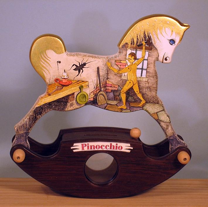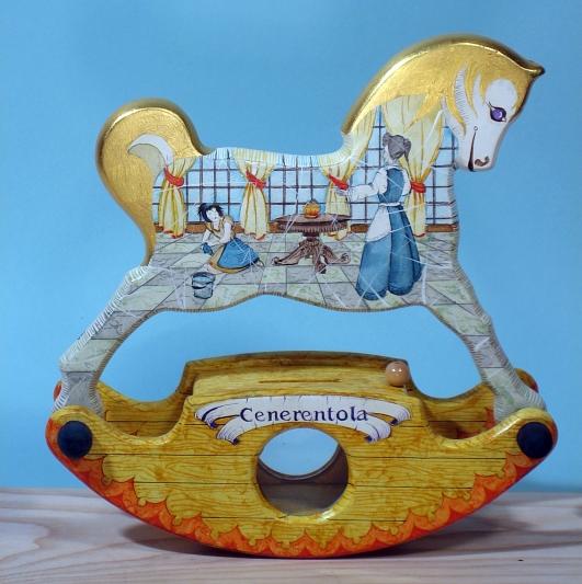 La collezione cosiddetta " Salvadanaio " rappresenta pezzi unici finemente lavorati con legni pregiati, il tema decorativo dedicato è,"le favole ", rappresentate con de immagini diverse una per lato, dipinte ad acquerello con criniera e coda ricoperte da foglia d'oro di ventidue carati ; Ogni opera è unica numerata , catalogata e siglata su un certificato di autenticità .