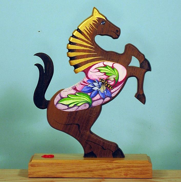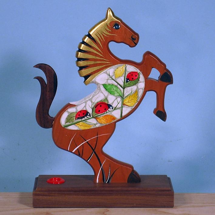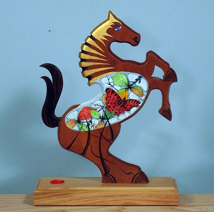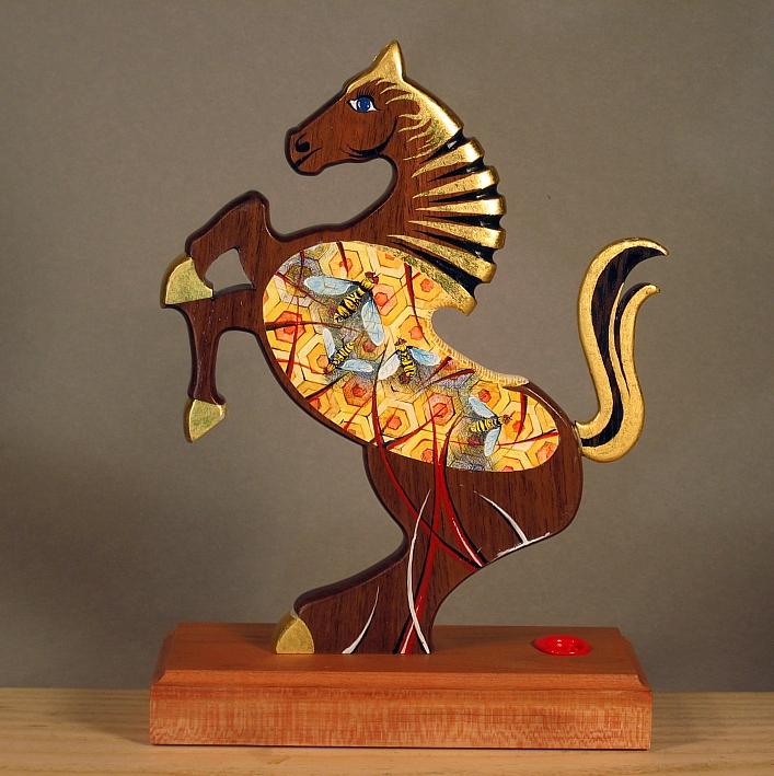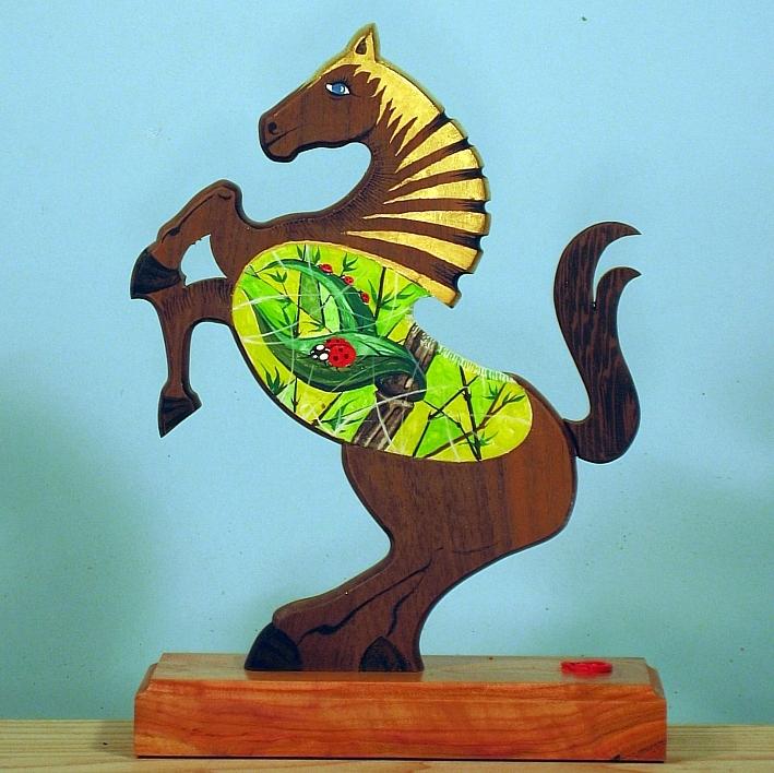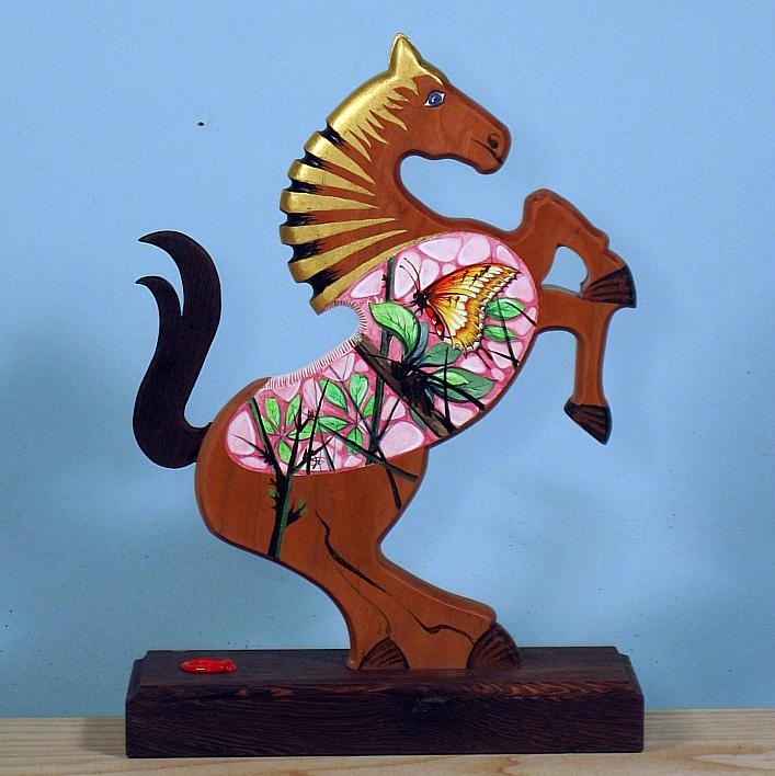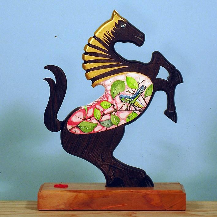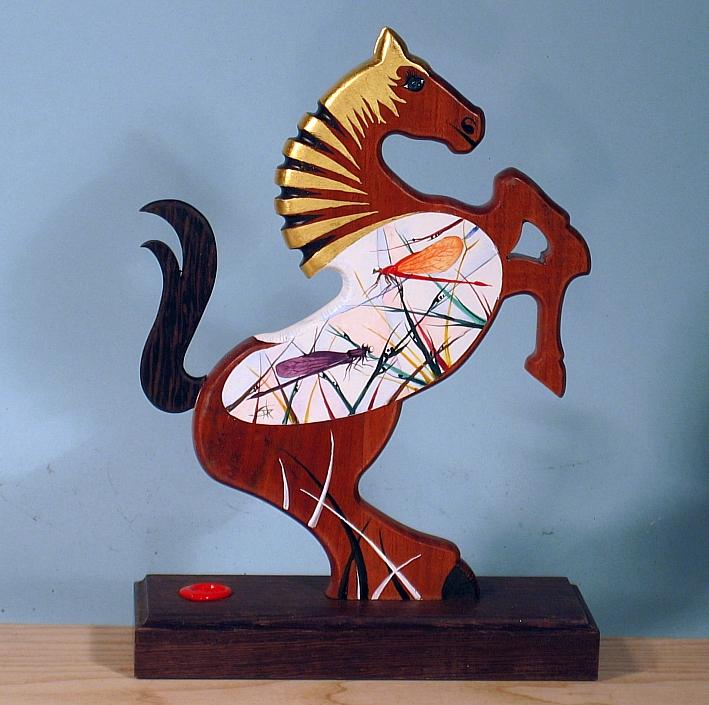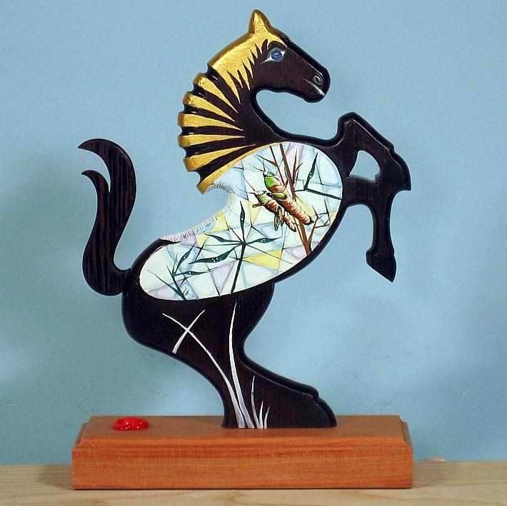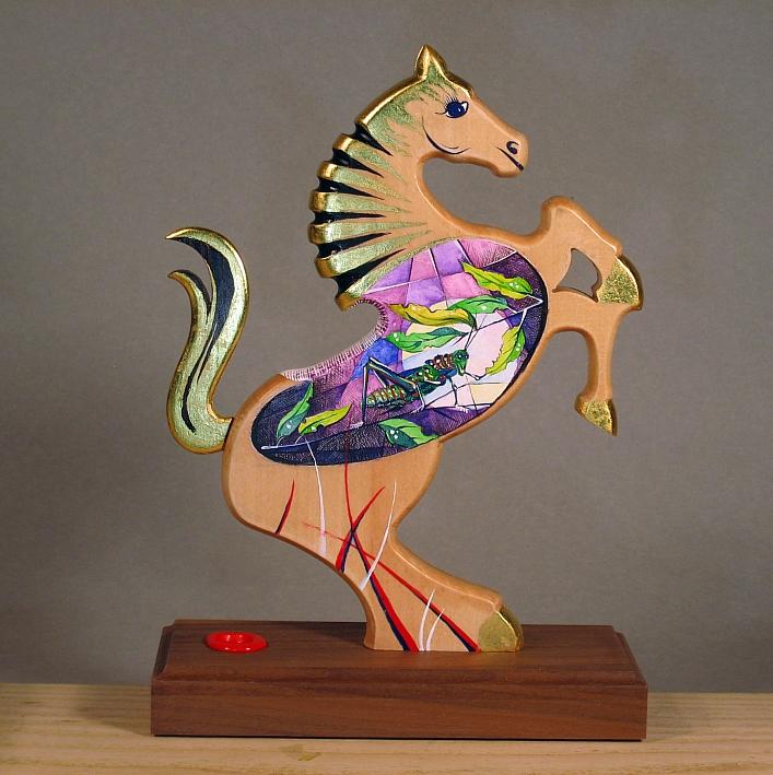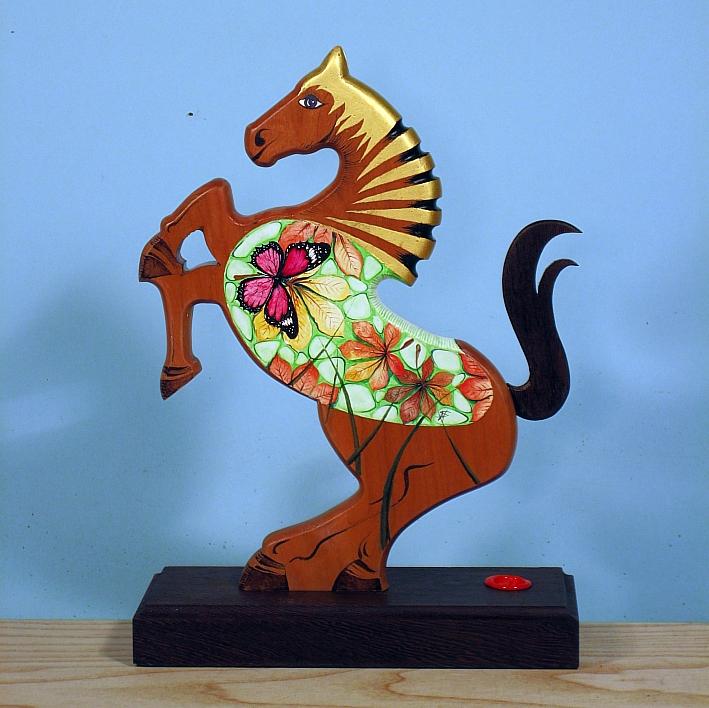 The Brisk collection is particular because the pony can act as bookends, the decorative theme is "leaves and insects", the technique as per tradition is in variously diluted and buffered watercolor, the mane is covered with twenty-two gold leaf carats. The work is unique, numbered, cataloged and signed on a certificate of authenticity.