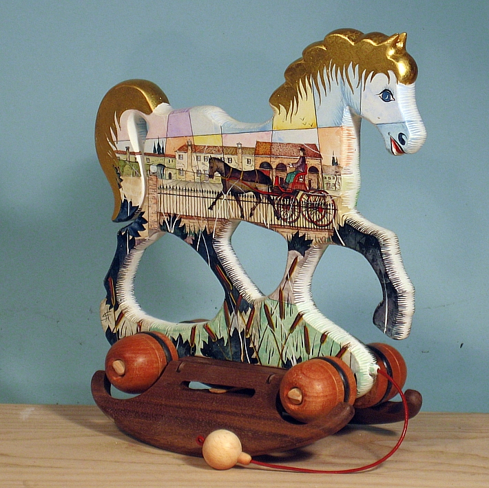 Giocattoli d'arte da collezione, realizzati con legni pregiati, dipinti ad acquerello variamente diluito e tampone con finiture in foglia d'oro 22Kt. Sono tutti pezzi unici, numerati e catalogati, forniti di certificato di produzione firmato dall'artista e sigillati con logo in cera lacca. Ideali per il collezionista, per un regalo di prestigio, per l'arredamento, opere rivolte a bambini e ragazzi come forma educativa per avvicinarli all'arte. Collectible art toys made of precious wood, painted with watercolor and swab with 22Kt gold leaf finishes. They are all unique pieces, numbered and cataloged, provided with a production certificate signed by the artist and sealed with lacquer wax logo. Ideal for the collector, for a prestigious gift, for furnishings, works directed at children and teens as an educational form to bring them closer to art.