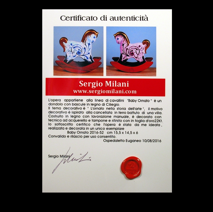 Giocattoli d'arte da collezione, realizzati con legni pregiati, dipinti ad acquerello variamente diluito e tampone con finiture in foglia d'oro 22Kt. Sono tutti pezzi unici, numerati e catalogati, forniti di certificato di produzione firmato dall'artista e sigillati con logo in cera lacca. Ideali per il collezionista, per un regalo di prestigio, per l'arredamento, opere rivolte a bambini e ragazzi come forma educativa per avvicinarli all'arte. Collectible art toys made of precious wood, painted with watercolor and swab with 22Kt gold leaf finishes. They are all unique pieces, numbered and cataloged, provided with a production certificate signed by the artist and sealed with lacquer wax logo. Ideal for the collector, for a prestigious gift, for furnishings, works directed at children and teens as an educational form to bring them closer to art.