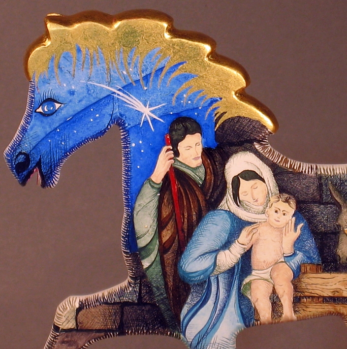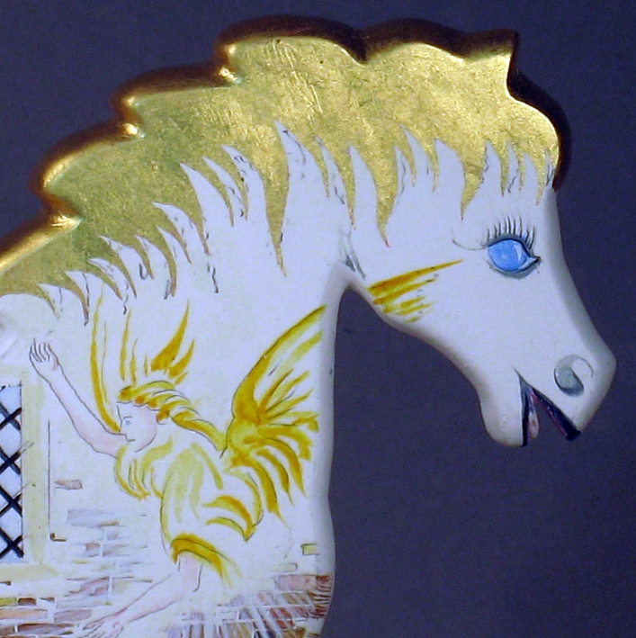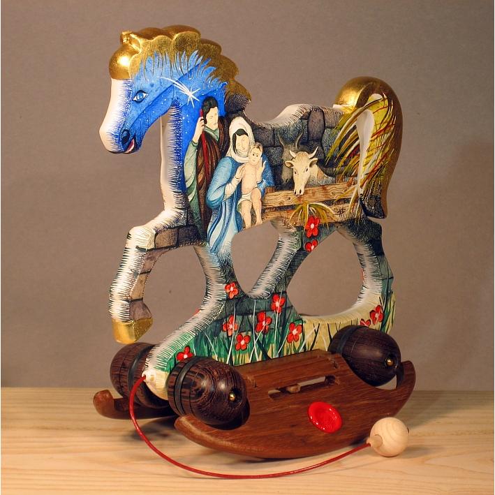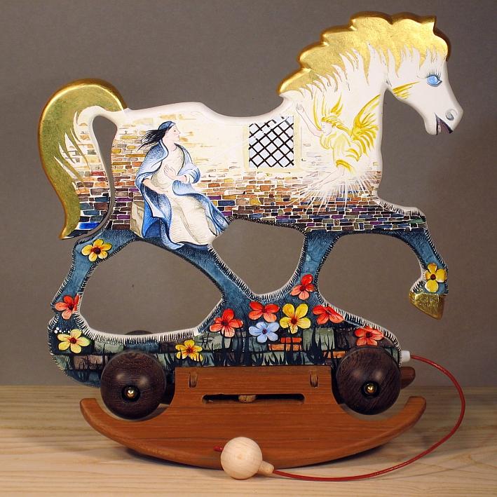 Il cavallo della linea Dream è un dondolo che si può trasformare in trainabile. E' realizzato manualmente in legno, con ruote e base a dondolo in legno pregiato a vista, il tema decorativo è, "l'annunciazione a Maria e la Natività di Gesù " L'interpretazione è sviluppata con due scene diverse una per lato. La decorazione è realizzata con tecnica ad acquerello e tampone, la criniera e la coda come da tradizione sono in foglia d'oro 22 Kt. L'opera è corredata da un certificato di autenticazione con foto, numero di catalogo, dichiarazione di opera unica e firma dell'artista.