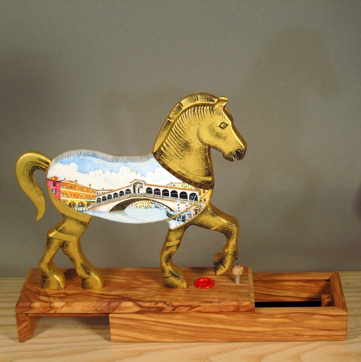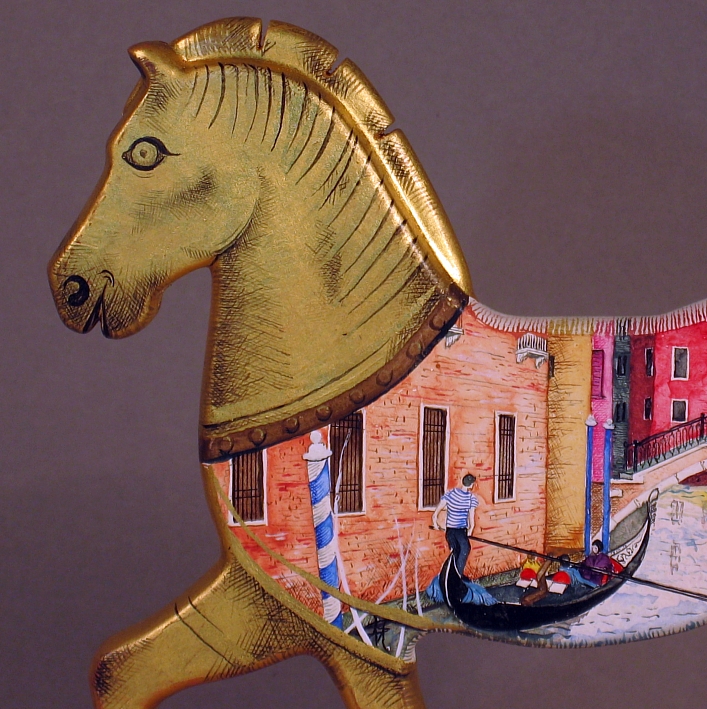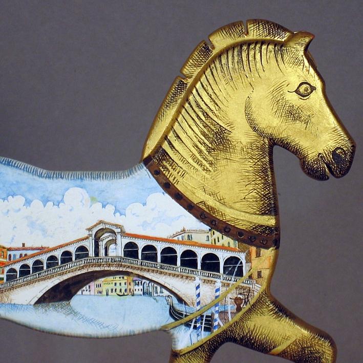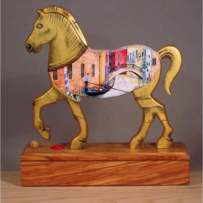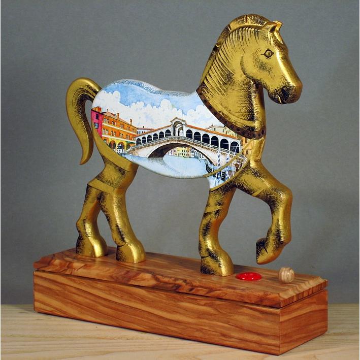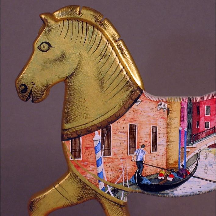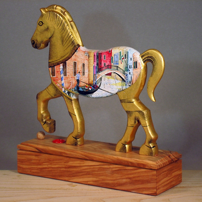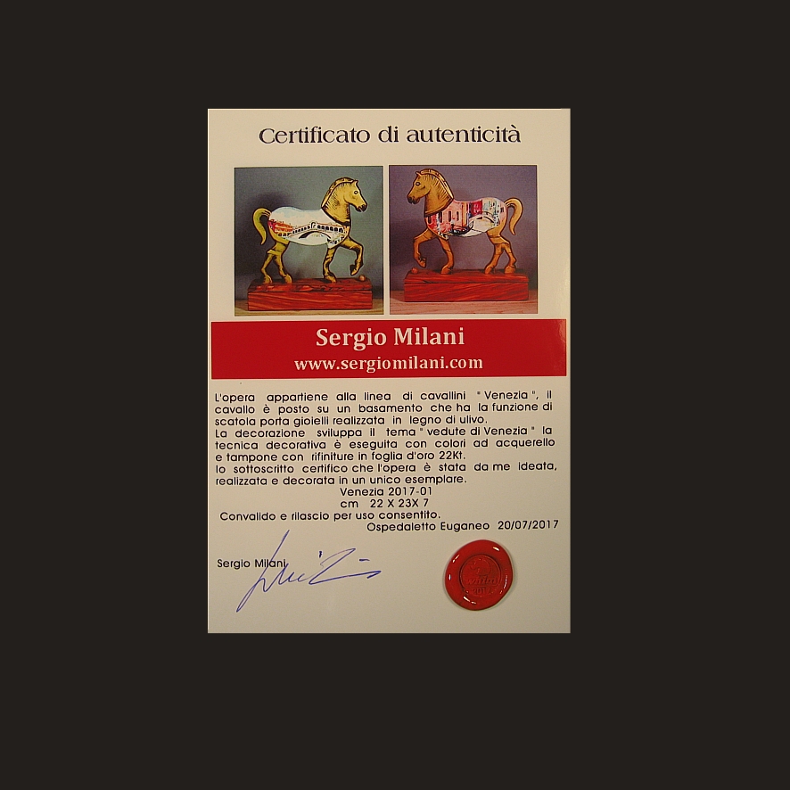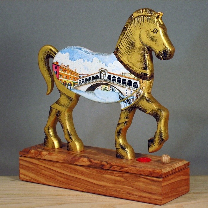 The work belongs to the line of pony, "Venice", the horse, whose profile is inspired by the golden bronze horses present on the Basilica of San Marco, is placed on a base which serves as a jewelery box, it is made of wood Of olive trees. The decoration develops the theme "Vedute and architectural detail of Venice", the decorative technique is carried out with watercolor and swabs with gold leaf base 22 Kt.