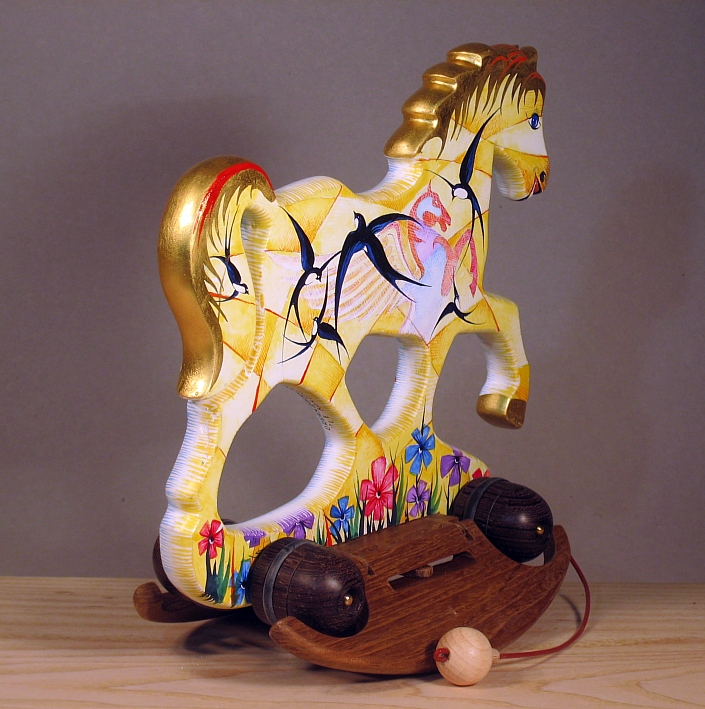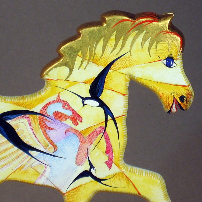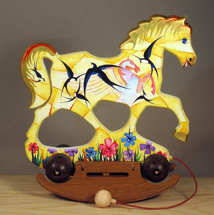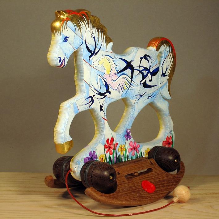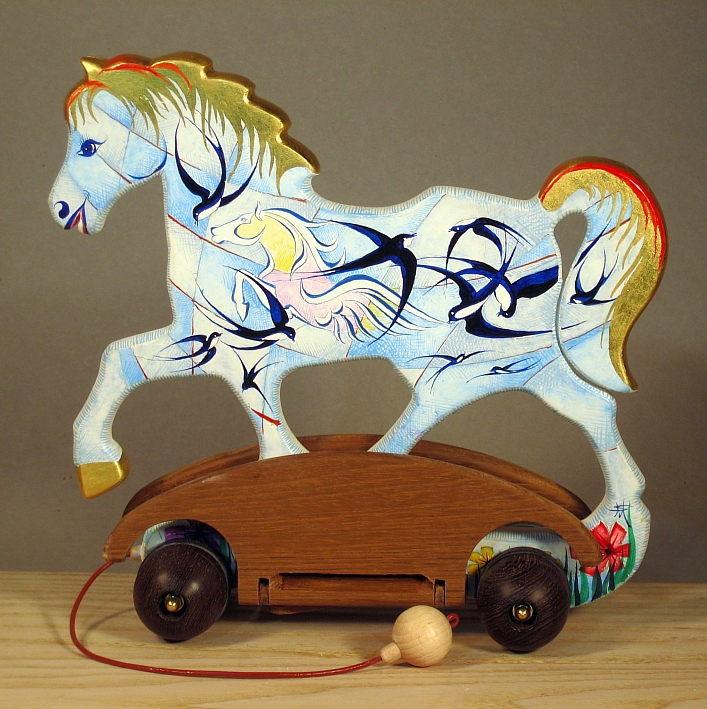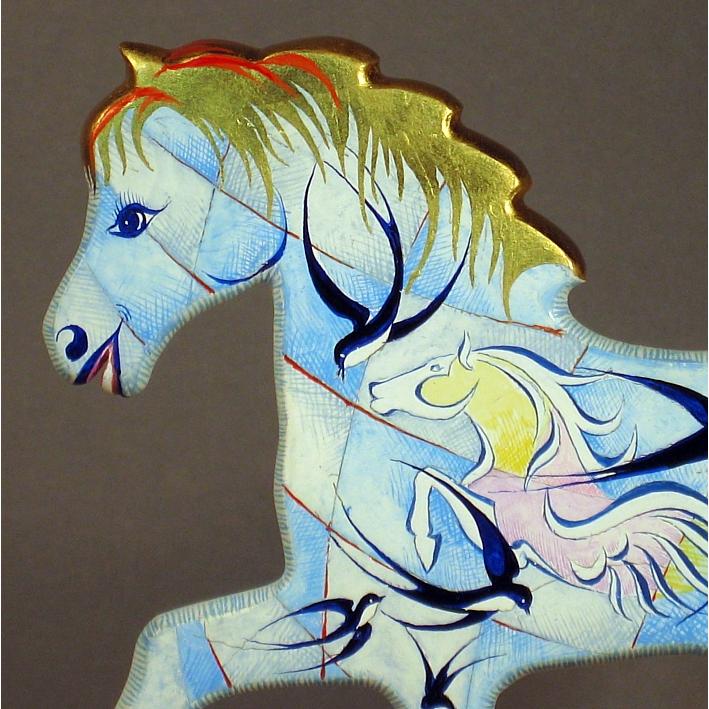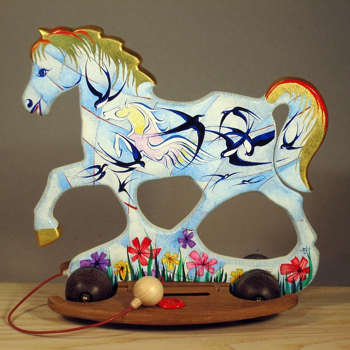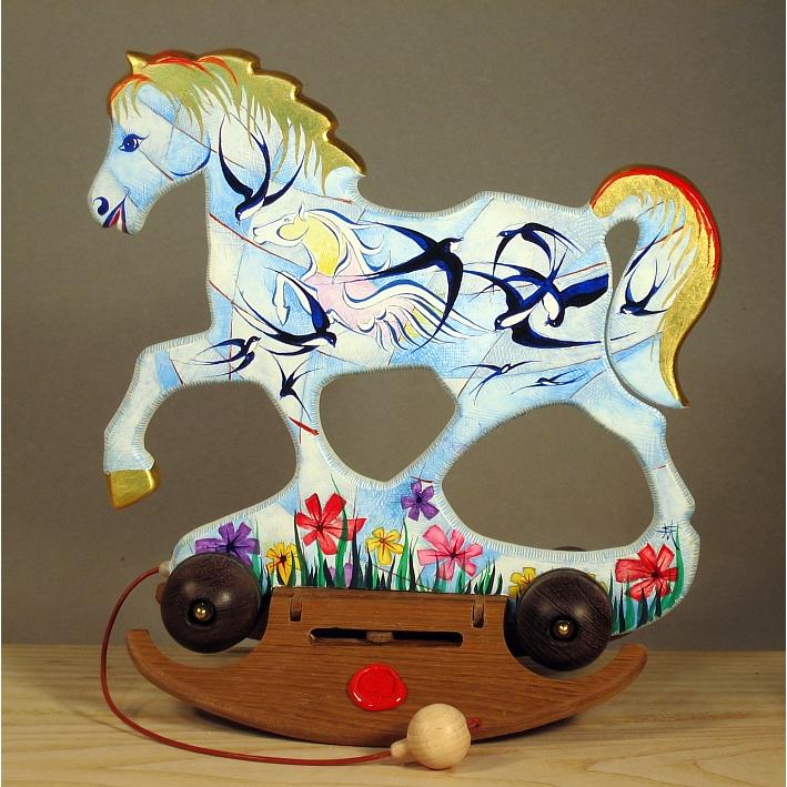 L'opera appartiene alla linea di cavallini "Dream", è un dondolo trasformabile in trainabile. Il supporto a dondolo è realizzato in legno di Teak, mentre le ruote in legno Wengè. Il tema decorativo è, "Il cavallo, la natura e il paesaggio". La decorazione è eseguita con tecnica ad acquerello e tampone con finiture in foglia d'oro 22 Kt. Le due scene presentano uno stormo di rondini con sullo sfondo l'immagine di Pegaso interpretate con gamma cromatica diversa.