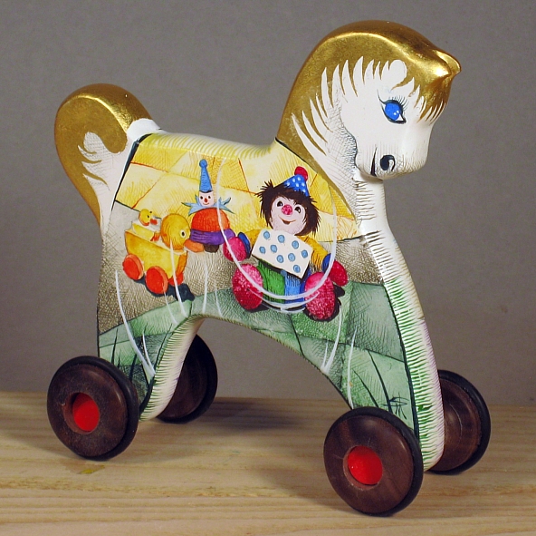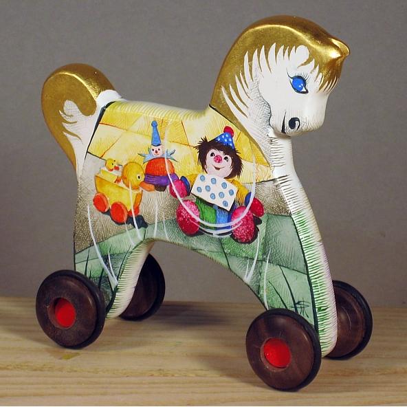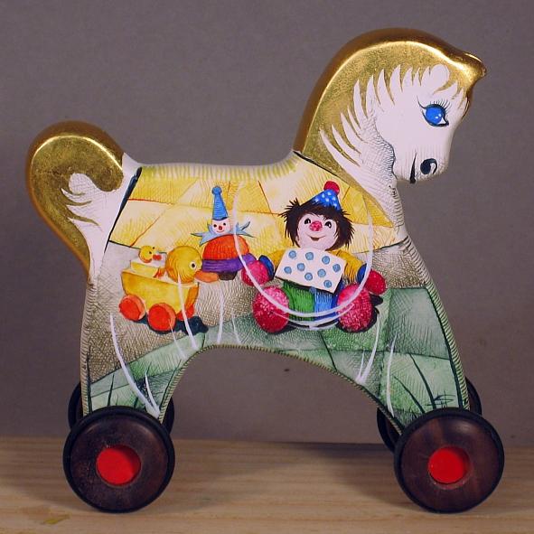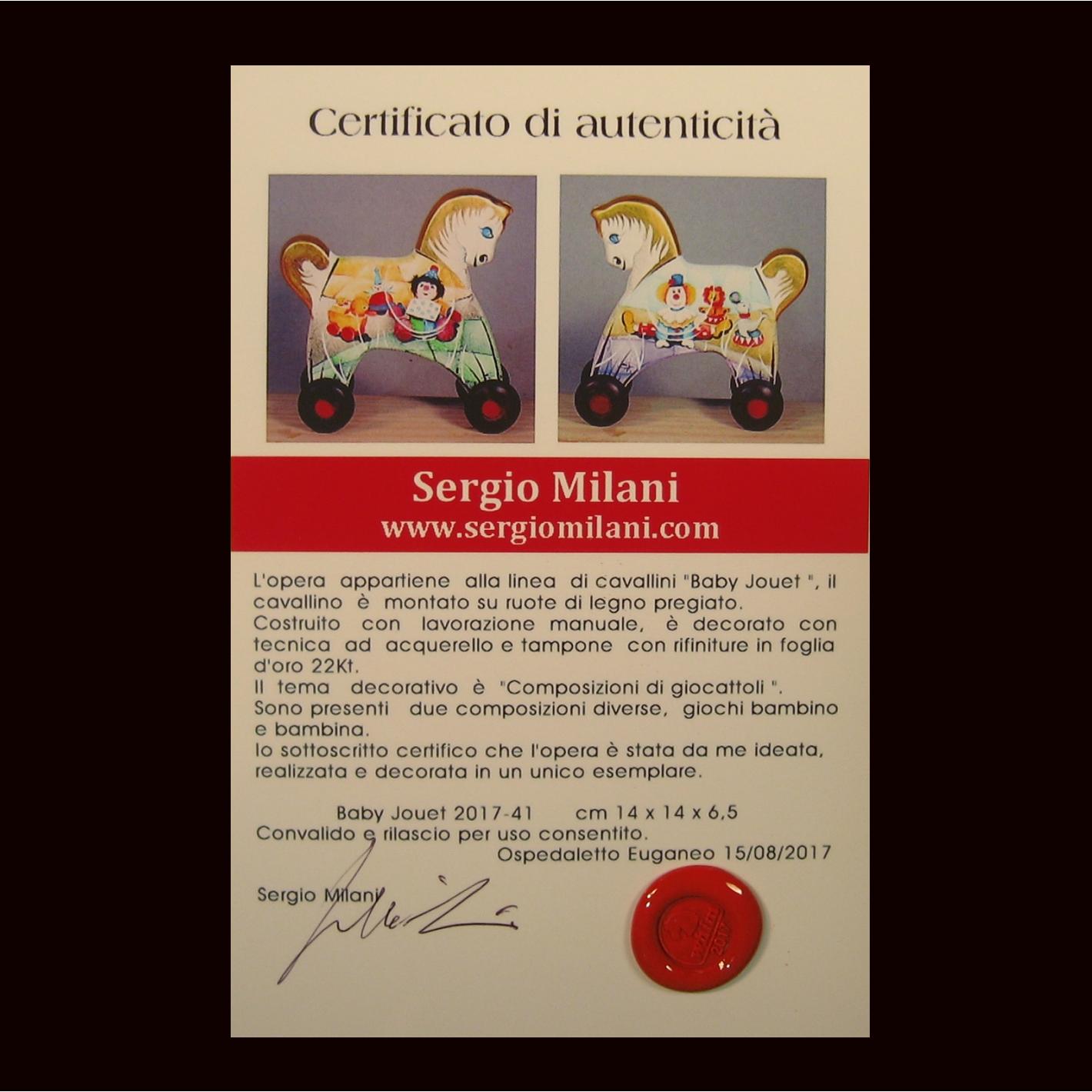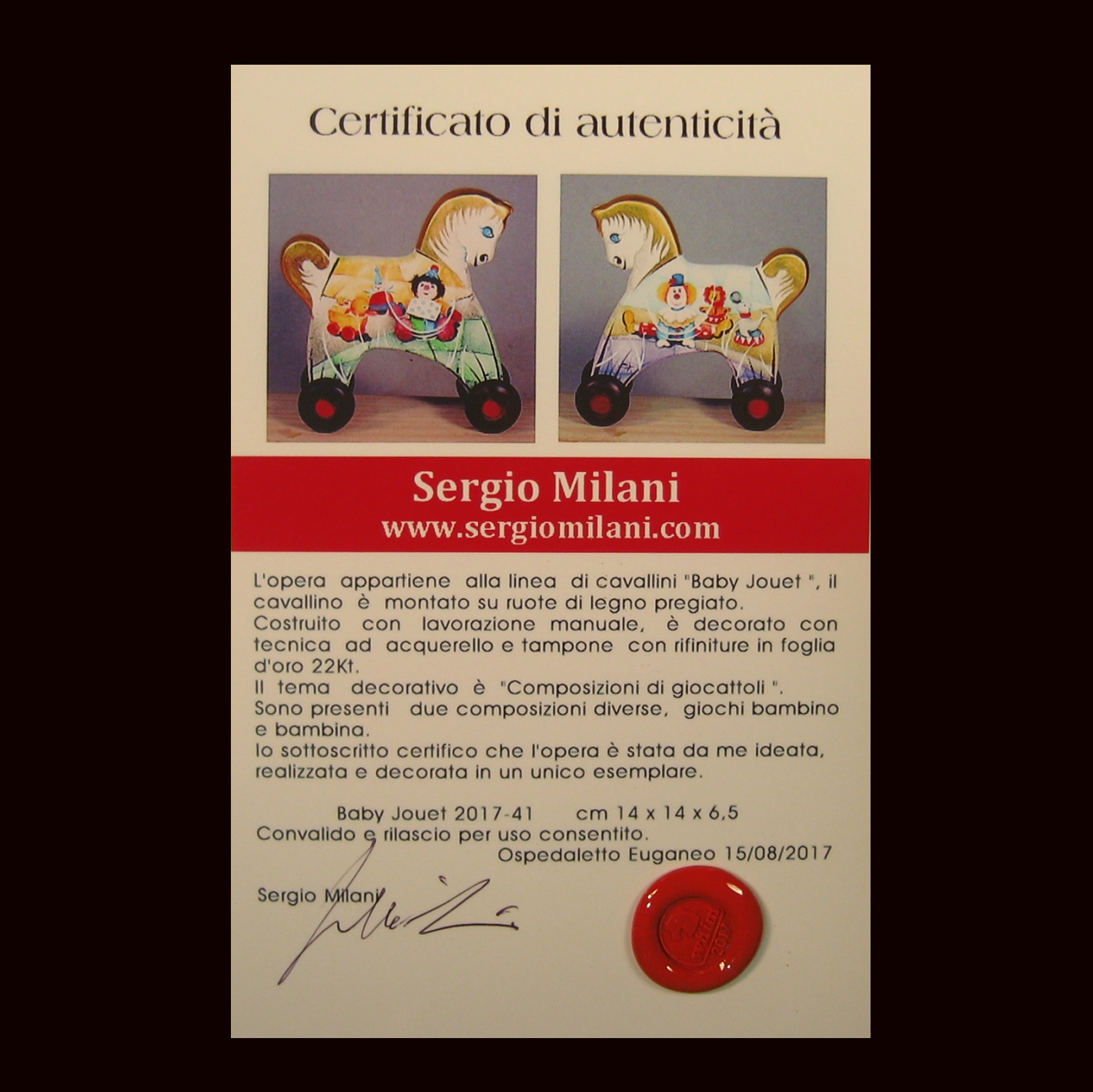 Il cavallo della linea Baby Jouet è costruito in legno, è montato su ruote in legno pregiato, il tema decorativo è " Composizioni di giocattoli", sono presenti due composizioni diverse, da un lato con giocattoli bambino, dal lato opposto giocattoli bambina, La decorazione è realizzata con tecnica ad acquerello e tampone con finiture in foglia d'oro 22 Kt. L'opera è munita di certificato di autenticità con foto, numero di catalogo, dichiarazione di opera unica e firma dell'artista.