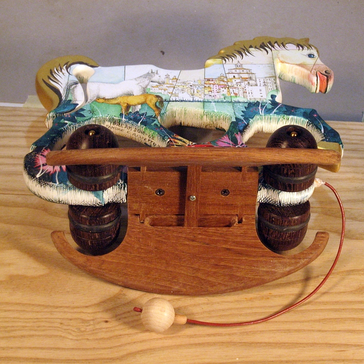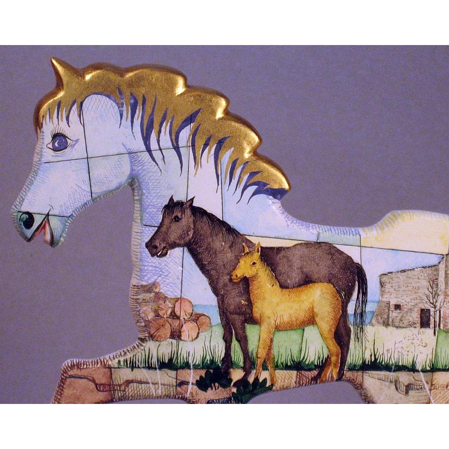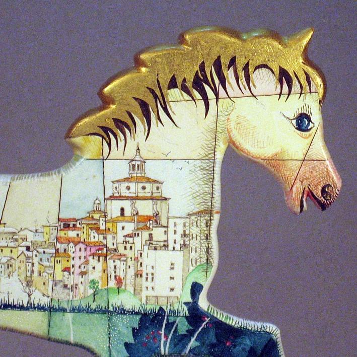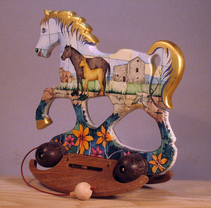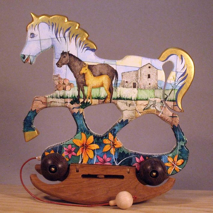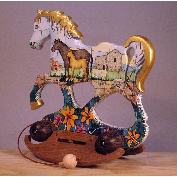 Artista Sergio Milani - Dream 2018-63 " Amore e Rispetto", Ideato, costruito e dipinto in Italy - dimensioni cm 22x23x12 - peso Kg 0,300 Il cavallo della linea Dream è un dondolo che si può trasformare in trainabile. E' realizzato manualmente in legno, con ruote e base a dondolo in legno pregiato, il tema decorativo è, " la natura, il paesaggio e il cavallo ", l'interpretazione è sviluppata con due scene diverse una per lato. La decorazione è realizzata con tecnica ad acquerello e tampone, la criniera e la coda come da tradizione sono in foglia d'oro 22 Kt. L'opera è corredata da un certificato di autenticazione con foto, numero di catalogo, dichiarazione di opera unica e firma dell'artista.