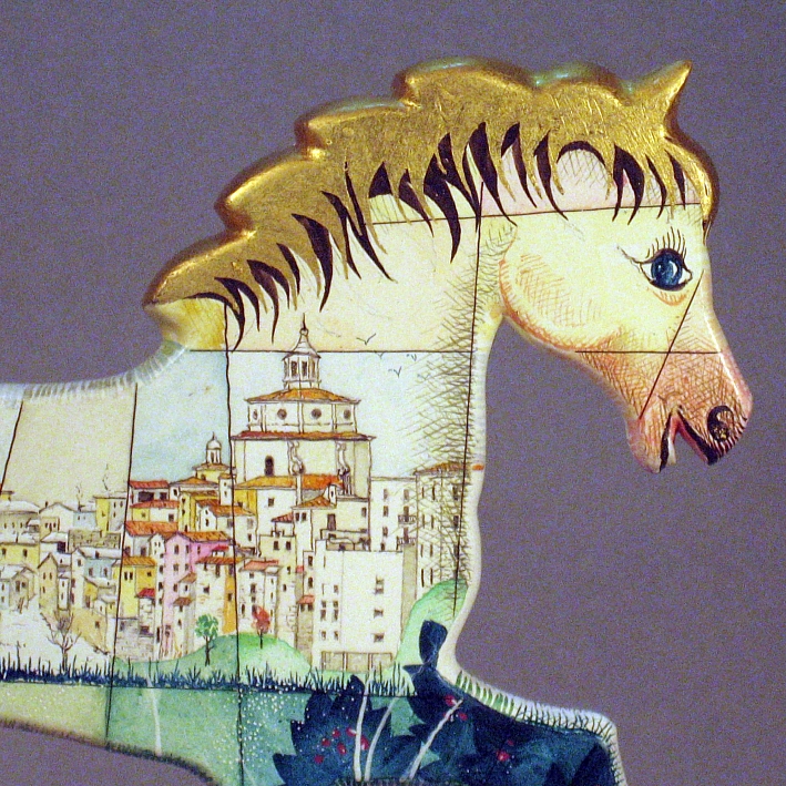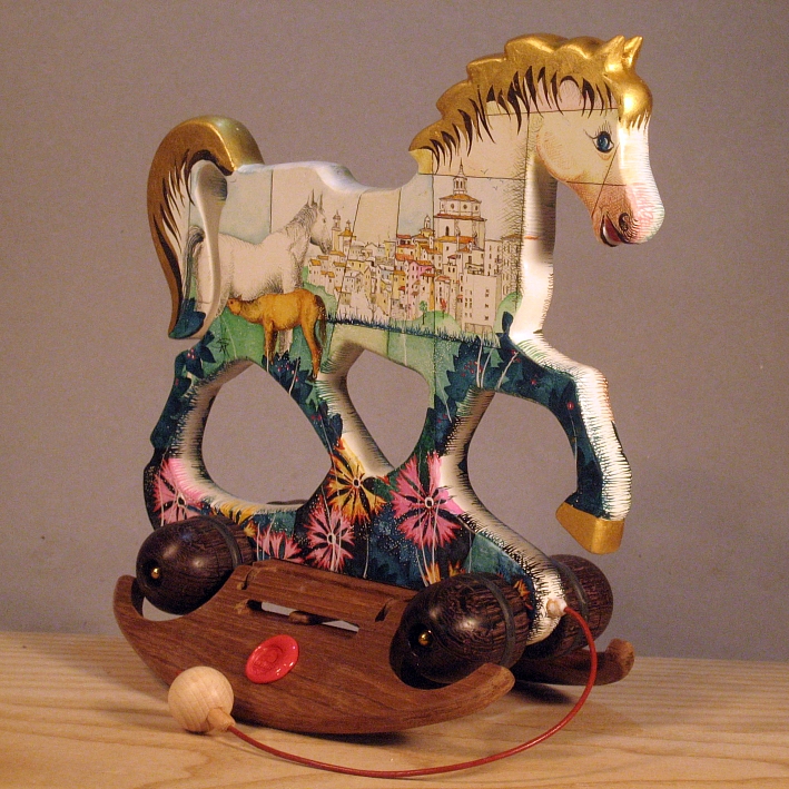 Giocattoli d'arte da collezione, realizzati con legni pregiati, dipinti ad acquerello variamente diluito e tampone con finiture in foglia d'oro 22Kt. Sono tutti pezzi unici, numerati e catalogati, forniti di certificato di produzione firmato dall'artista e sigillati con logo in cera lacca. Ideali per il collezionista, per un regalo di prestigio, per l'arredamento, opere rivolte a bambini e ragazzi come forma educativa per avvicinarli all'arte. Collectible art toys made of precious wood, painted with watercolor and swab with 22Kt gold leaf finishes. They are all unique pieces, numbered and cataloged, provided with a production certificate signed by the artist and sealed with lacquer wax logo. Ideal for the collector, for a prestigious gift, for furnishings, works directed at children and teens as an educational form to bring them closer to art.