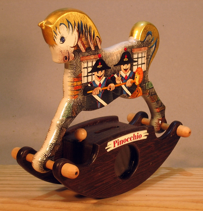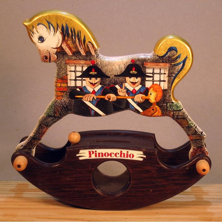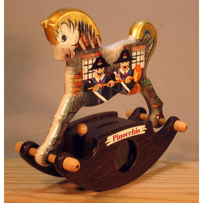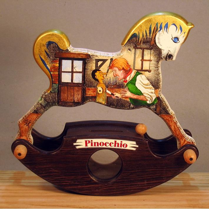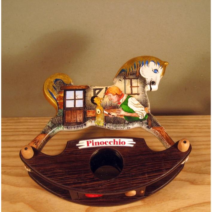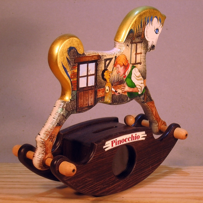 Giocattoli d'arte del maestro Sergio Milani, collezione "whim" linea "Money Box" Money Box 2020-38"Pinocchio", ideato, costruito e dipinto in Italy - dimensioni cm 21 x 20 x 9 peso Kg 0,300 I cavallini della linea Money Box sono realizzati interamente in legno, la base a dondolo è in legno pregiato e serve da contenitore con un oblò per ispezionare l'interno, uno spinotto apre una porticina scorrevole nella parte inferiore del contenitore; Il cavallo è preparato alla decorazione con un fondo bianco specifico per legno. Il tema decorativo dedicato a questa linea è, " Le favole ", con due scene differenti, una per lato. La decorazione è realizzata con la tecnica ad acquerello variamente diluito e tamponato con finiture in foglia d'oro 22 Kt. L'opera è corredata da un certificato di autenticazione con foto, numero di catalogo, dichiarazione di opera unica e firma dell'artista.