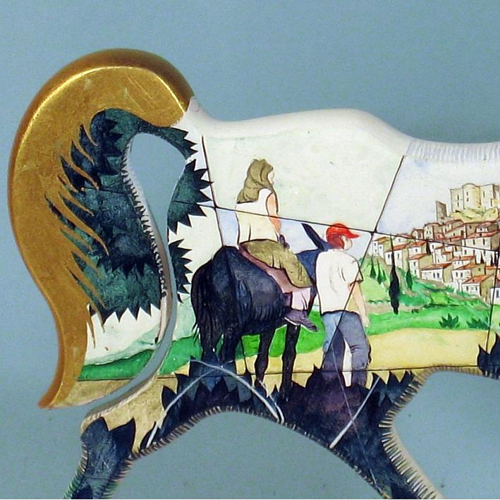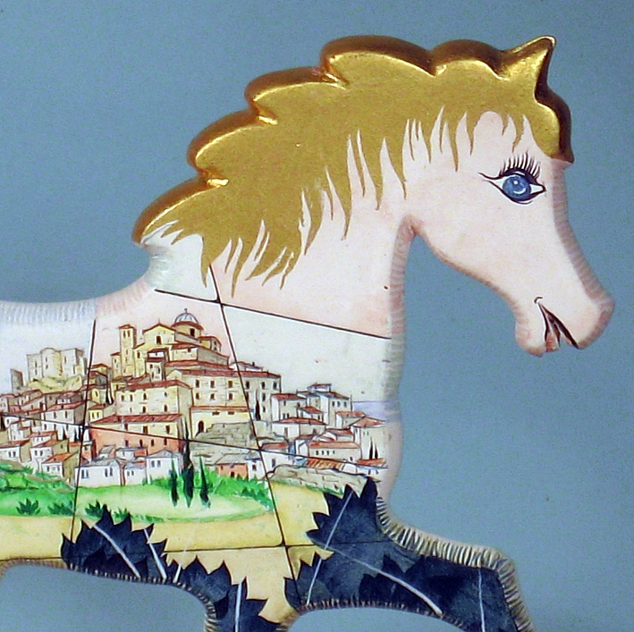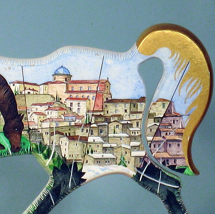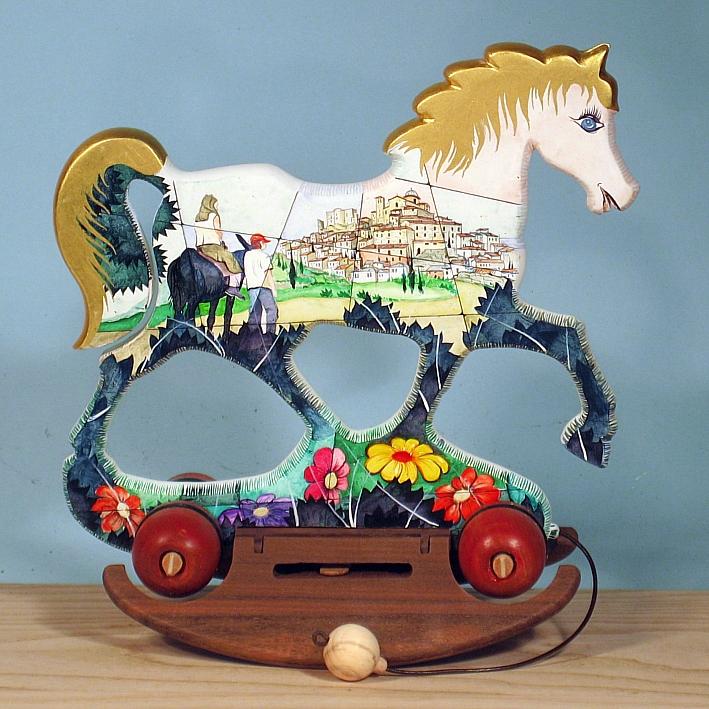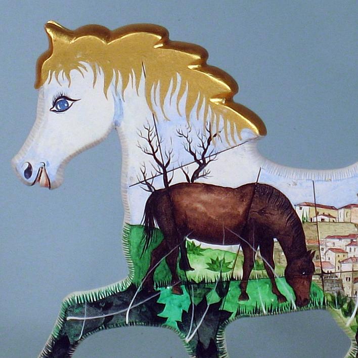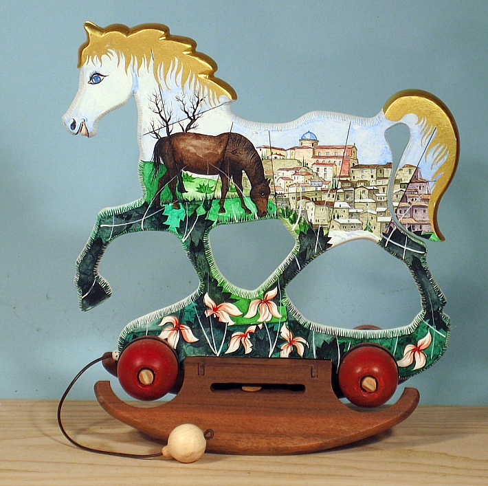Giocattoli d'arte da collezione, realizzati con legni pregiati, dipinti ad acquerello variamente diluito e tampone con finiture in foglia d'oro 22Kt. Sono tutti pezzi unici, numerati e catalogati, forniti di certificato di produzione firmato dall'artista e sigillati con logo in cera lacca. Ideali per il collezionista, per un regalo di prestigio, per l'arredamento, opere rivolte a bambini e ragazzi come forma educativa per avvicinarli all'arte. Collectible art toys made of precious wood, painted with watercolor and swab with 22Kt gold leaf finishes. They are all unique pieces, numbered and cataloged, provided with a production certificate signed by the artist and sealed with lacquer wax logo. Ideal for the collector, for a prestigious gift, for furnishings, works directed at children and teens as an educational form to bring them closer to art.