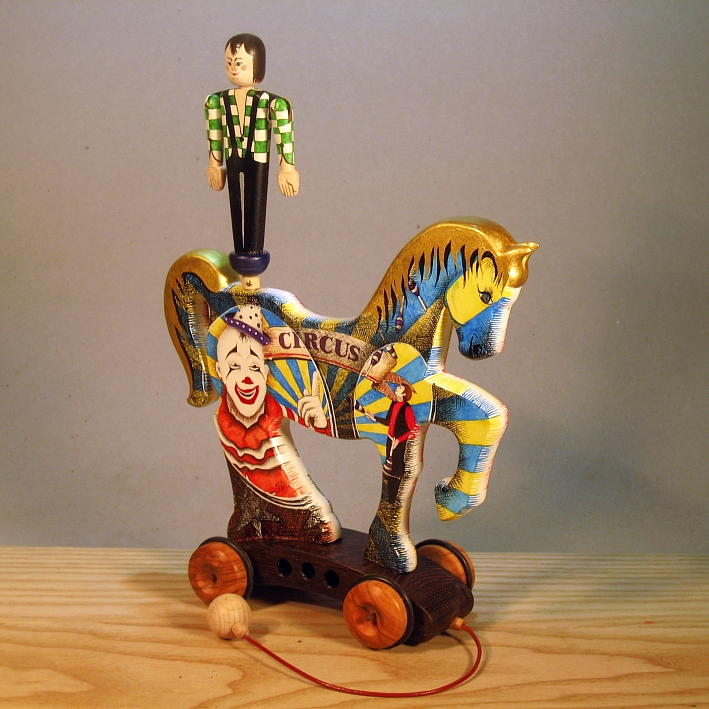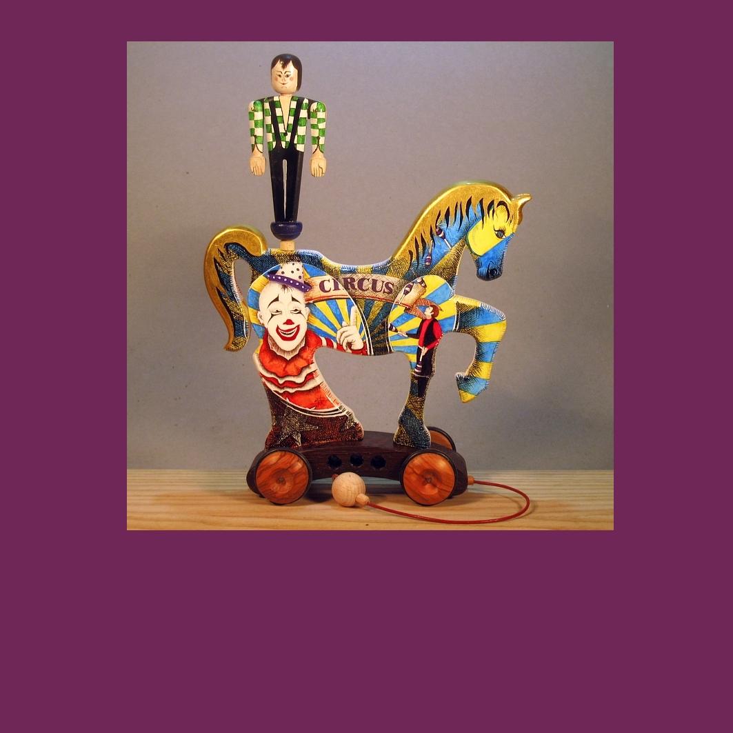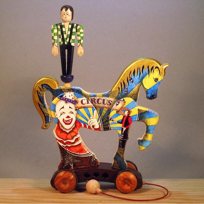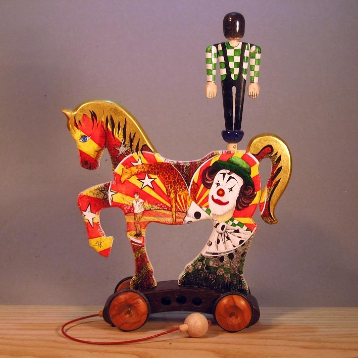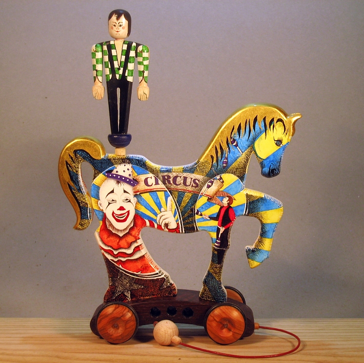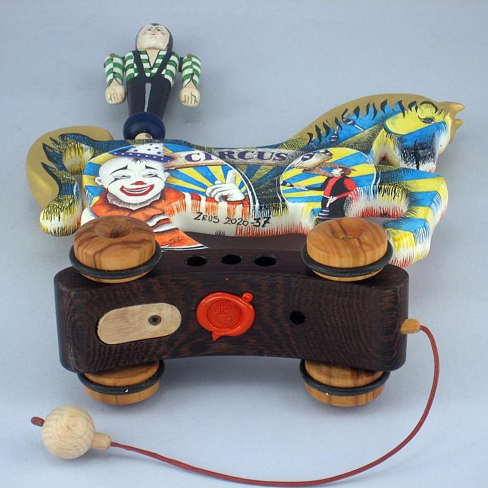 Giocattoli d'arte del maestro Sergio Milani - collezione "whim" - linea "Zeus".Zeus 2020-37, ideato, costruito e dipinto in italy - dimensioni cm 19,5 x 27 x 7,5, peso Kg o,300.I cavallini della linea Zeus sono realizzati completamente in legno con lavorazione manuale, essi interpretano il cavallo circense con il suo equilibrista. L'opera è montata su un carrello realizzato con legni pregiati - durante il traino il giocoliere ruota e apre dinamicamente le braccia, il cavallino è preparato alla pittura con fondo bianco specifico.Il tema decorativo dedicato alla linea è " scene circensi ", con due scene diverse una per lato, la decorazione è realizzata con tecnica ad acquerello variamente diluito e tamponato con finiture in foglia d'oro 22Kt.L'opera è autenticata con sigillo in cera lacca e da un certificato con foto, numero di catalogo e firma autografa dell'artista.