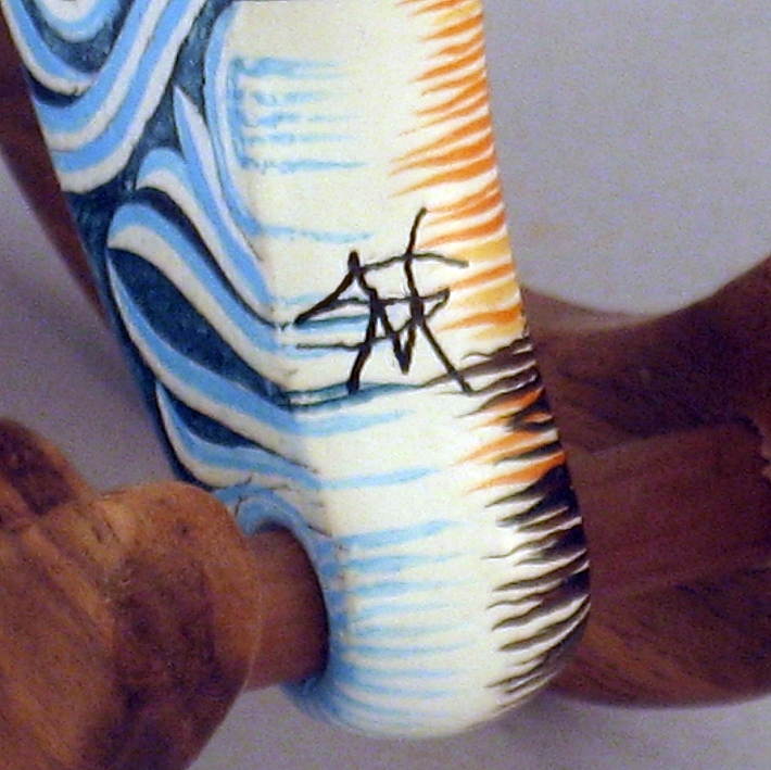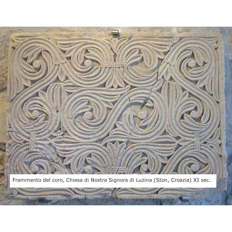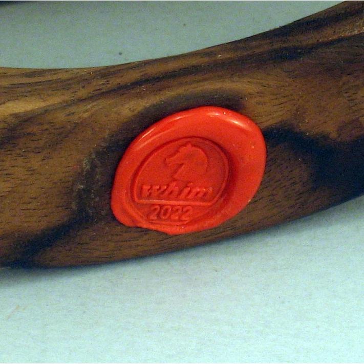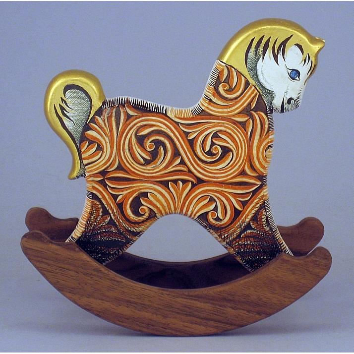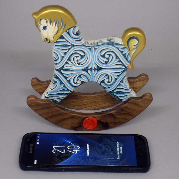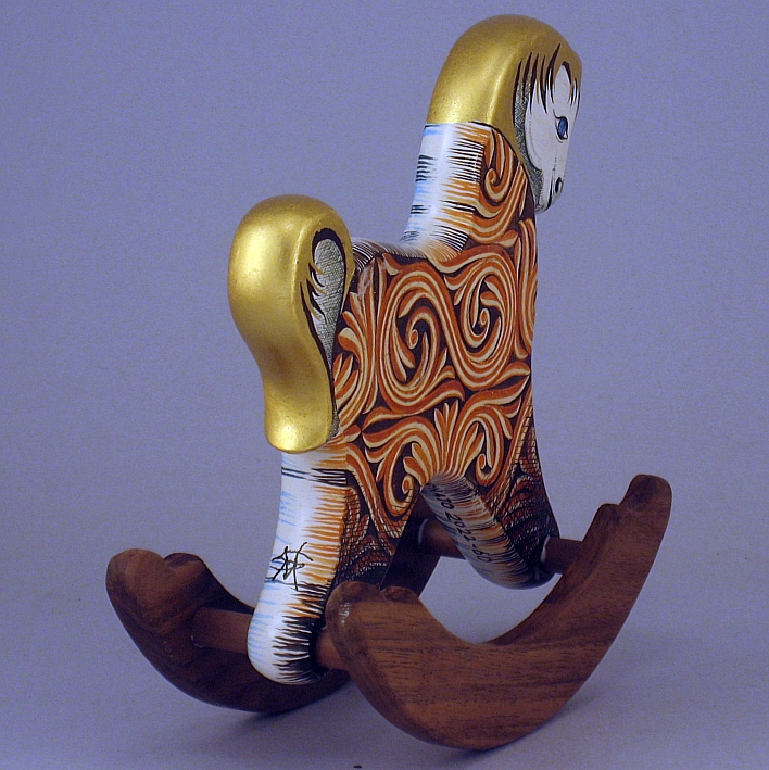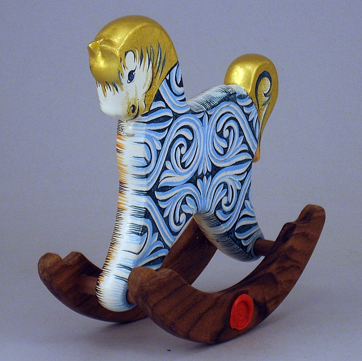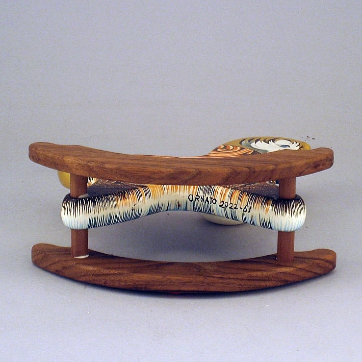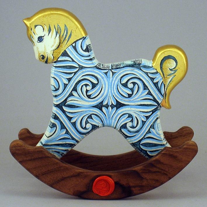 Collezione "whim", " Ornato 2022-61". il cavallino della linea Ornato è un piccolo dondolo costruito in legno con accurata lavorazione a manuale, le bascule dondolo sono realizzate in legno di noce, la tecnica decorativa è eseguita con colori ad acquerello variamente diluiti e finiture in foglia d'oro 22Kt.Il tema decorativo dedicato alla linea è "L'ornato nella storia dell'arte", la decorazione si ripete sui due lati con lo stesso disegno ma accordi cromatici differenti.La decorazione della presente opera è ispirata al motivo d'ornato di un frammento della balaustra del coro della Chiesa di Nostra Signora di Luzina, Ston-Croazia, IX-X secolo d.C.