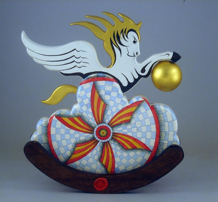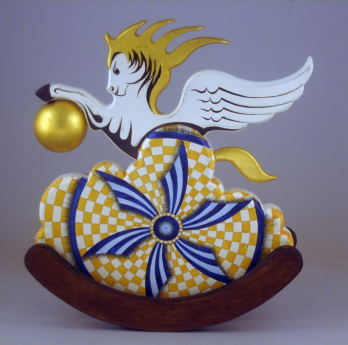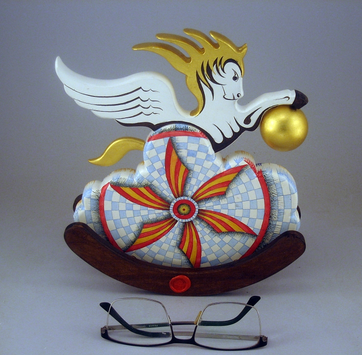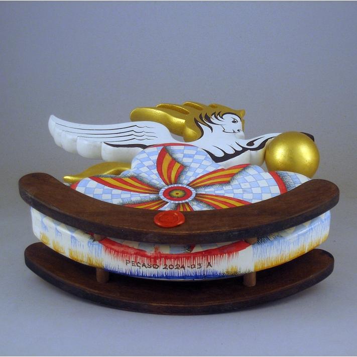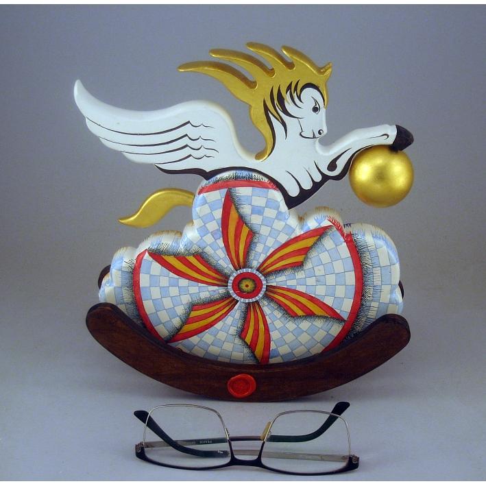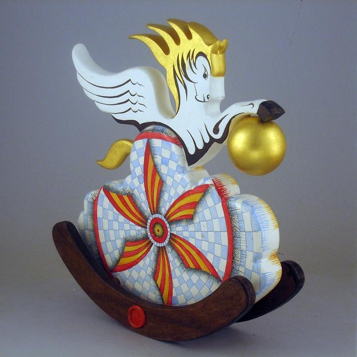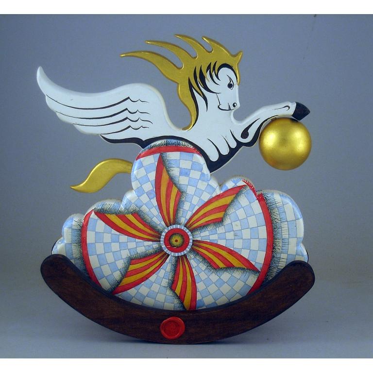 Pegaso 2024-03A - L'opera è eseguita in legno con meticolosa lavorazione manuale, essa è montata su un suppoto a dondolo in legno a vista.