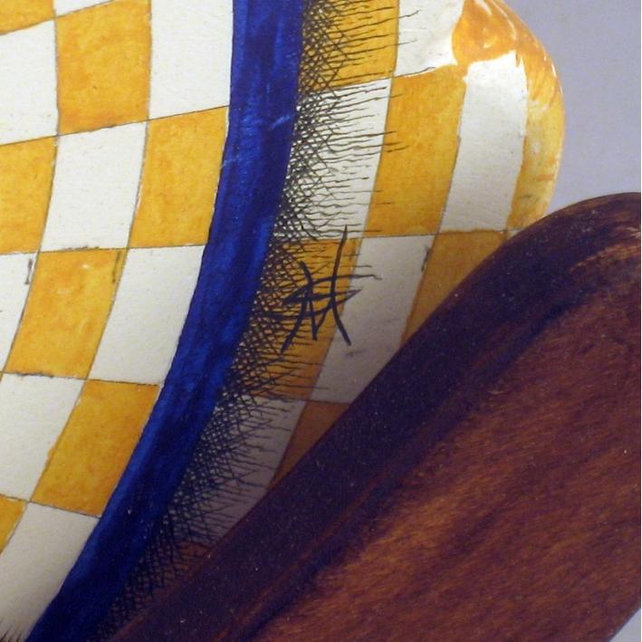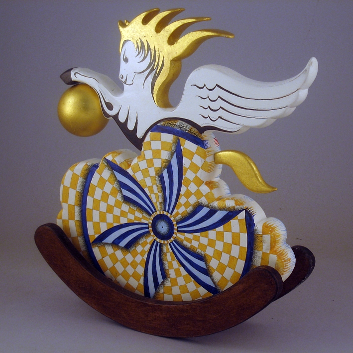 Giocattoli d'arte da collezione, realizzati con legni pregiati, dipinti ad acquerello variamente diluito e tampone con finiture in foglia d'oro 22Kt. Sono tutti pezzi unici, numerati e catalogati, forniti di certificato di produzione firmato dall'artista e sigillati con logo in cera lacca. Ideali per il collezionista, per un regalo di prestigio, per l'arredamento, opere rivolte a bambini e ragazzi come forma educativa per avvicinarli all'arte. Collectible art toys made of precious wood, painted with watercolor and swab with 22Kt gold leaf finishes. They are all unique pieces, numbered and cataloged, provided with a production certificate signed by the artist and sealed with lacquer wax logo. Ideal for the collector, for a prestigious gift, for furnishings, works directed at children and teens as an educational form to bring them closer to art.