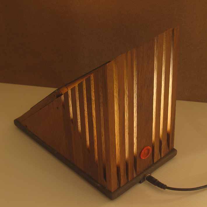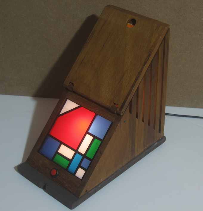 Collezione "whim", linea "Softlight"Questa lampada dal profilo triangolare come tutte le lampade di questa linea, è realizzata con due legni diversi, Noce americano e Frassino, l'elemento che la distingue dalle altre è la decorazione sempre diversa per renrerla un pezzo unico, in questa opera la composizione cromatica è geometrica ispirata a Mondrian ed eseguita con smalti per vetro su lastra acrilica.Dichiaro che la decorazione è esemplare unico, che l'opera è stata da me ideata e interamente realizzata, è siglata e autenticata con sigillo in cera lacca, completa l'autenticazione un certificato con foto, titolo e numero di catalogo, essa viene fornita con apposito alimentatore, lampada LED G4 30W e chiave per la eventuale sostituzione.