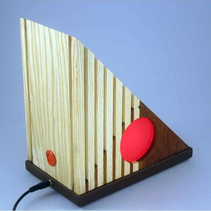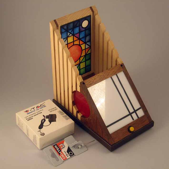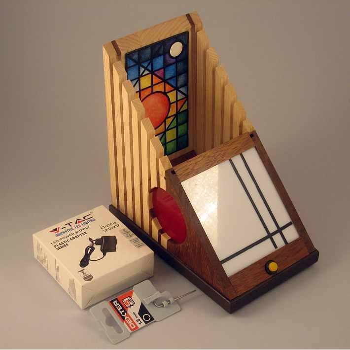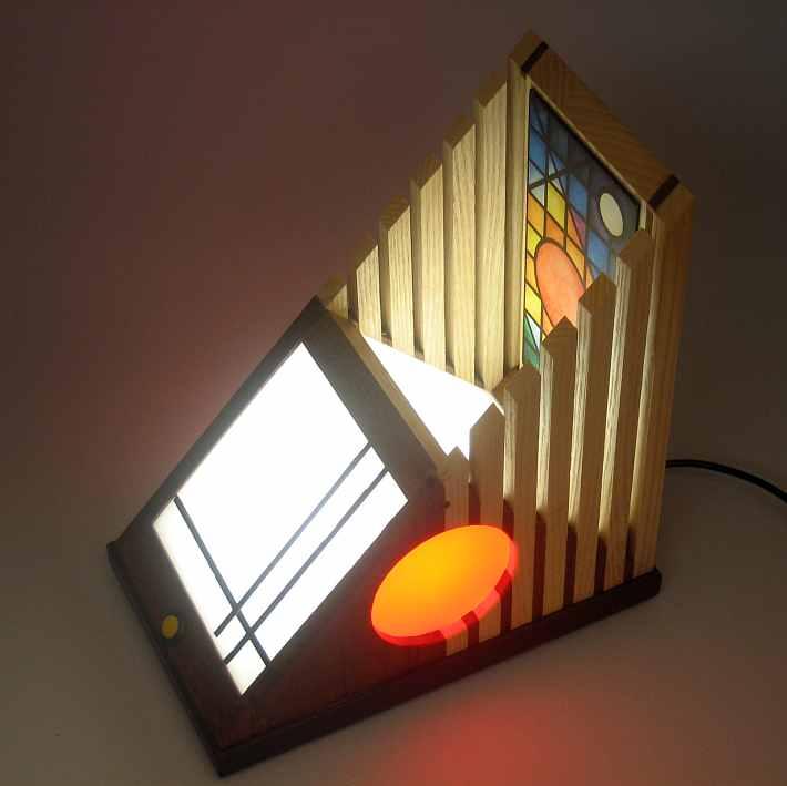 Collezione "whim", linea "Softlight"Questa lampada dal profilo triangolare come tutte le lampade di questa linea, è realizzata con due legni diversi, Noce americano e Frassino, l'elemento che la distingue dalle altre è la decorazione sempre diversa per renrerla un pezzo unico, in questa opera la composizione cromatica è geometrica ispirata a Mondrian ed eseguita con smalti per vetro su lastra acrilica.Dichiaro che la decorazione è esemplare unico, che l'opera è stata da me ideata e interamente realizzata, è siglata e autenticata con sigillo in cera lacca, completa l'autenticazione un certificato con foto, titolo e numero di catalogo, essa viene fornita con apposito alimentatore, lampada LED G4 30W e chiave per la eventuale sostituzione.