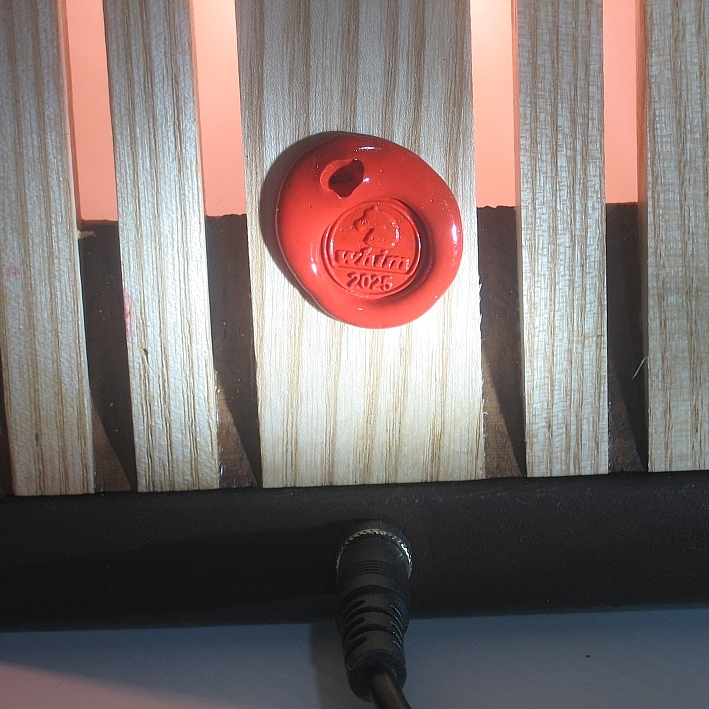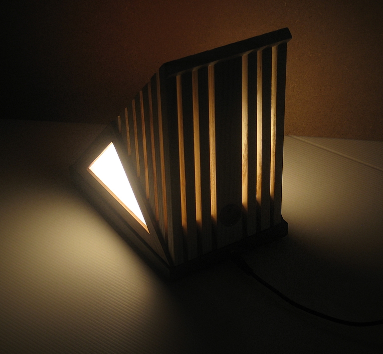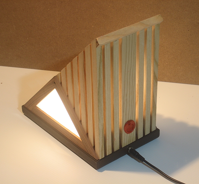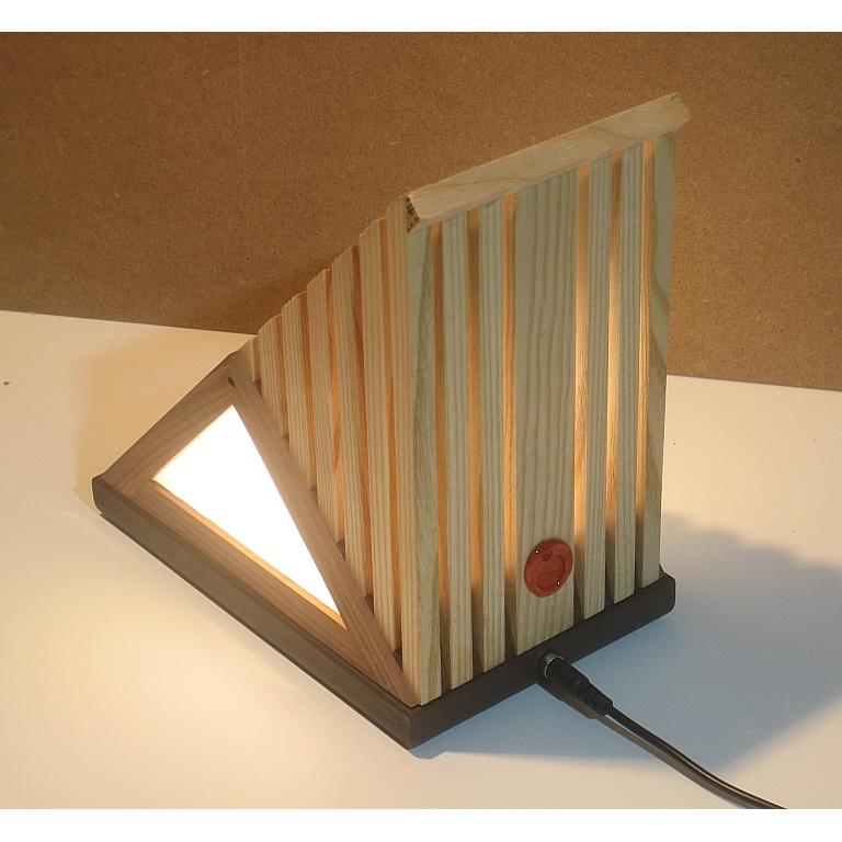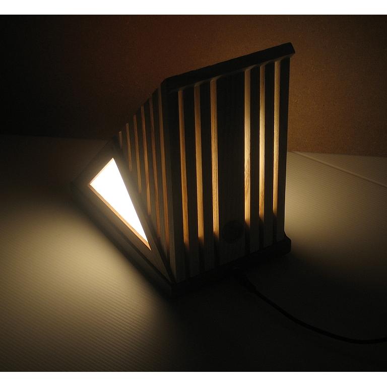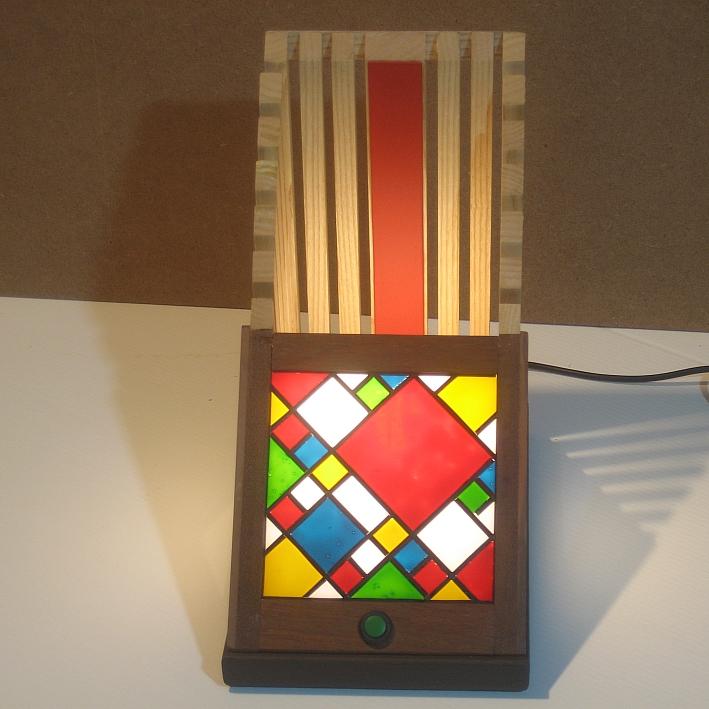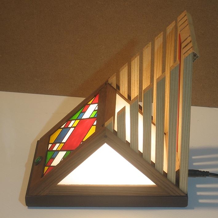 Collezione "whim", linea "Softlight"Questa lampada dal profilo triangolare come tutte le lampade di questa linea, è realizzata con due legni diversi, Noce americano e Frassino, l'elemento che la distingue dalle altre è la decorazione sempre diversa per renrerla un pezzo unico, in questa opera la composizione cromatica è geometrica ispirata a Mondrian ed eseguita con smalti per vetro su lastra acrilica.Dichiaro che la decorazione è esemplare unico, che l'opera è stata da me ideata e interamente realizzata, è siglata e autenticata con sigillo in cera lacca, completa l'autenticazione un certificato con foto, titolo e numero di catalogo, essa viene fornita con apposito alimentatore, lampada LED G4 30W e chiave per la eventuale sostituzione.
