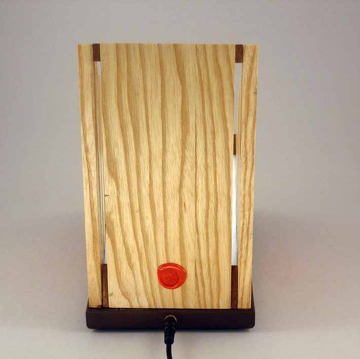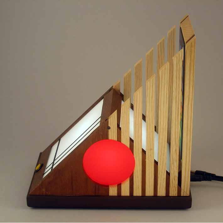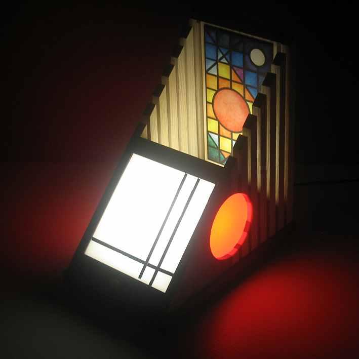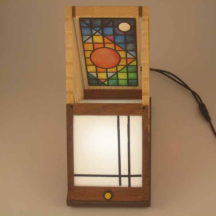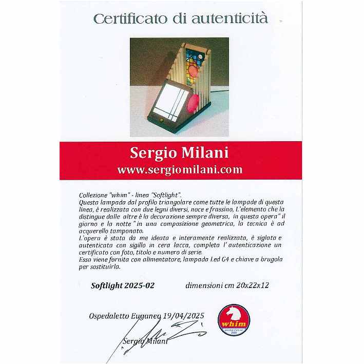 Collezione "whim", linea "Softlight"Questa lampada dal profilo triangolare come tutte le lampade di questa linea, è realizzata con due legni diversi, Noce americano e Frassino, l'elemento che la distingue dalle altre è la decorazione sempre diversa per renrerla un pezzo unico, in questa opera la composizione cromatica è geometrica ispirata a Mondrian ed eseguita con smalti per vetro su lastra acrilica.Dichiaro che la decorazione è esemplare unico, che l'opera è stata da me ideata e interamente realizzata, è siglata e autenticata con sigillo in cera lacca, completa l'autenticazione un certificato con foto, titolo e numero di catalogo, essa viene fornita con apposito alimentatore, lampada LED G4 30W e chiave per la eventuale sostituzione.