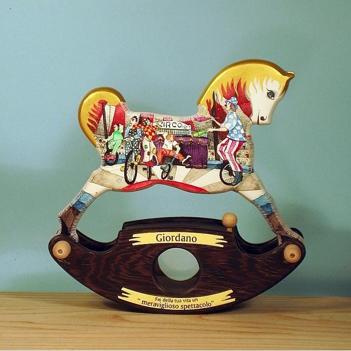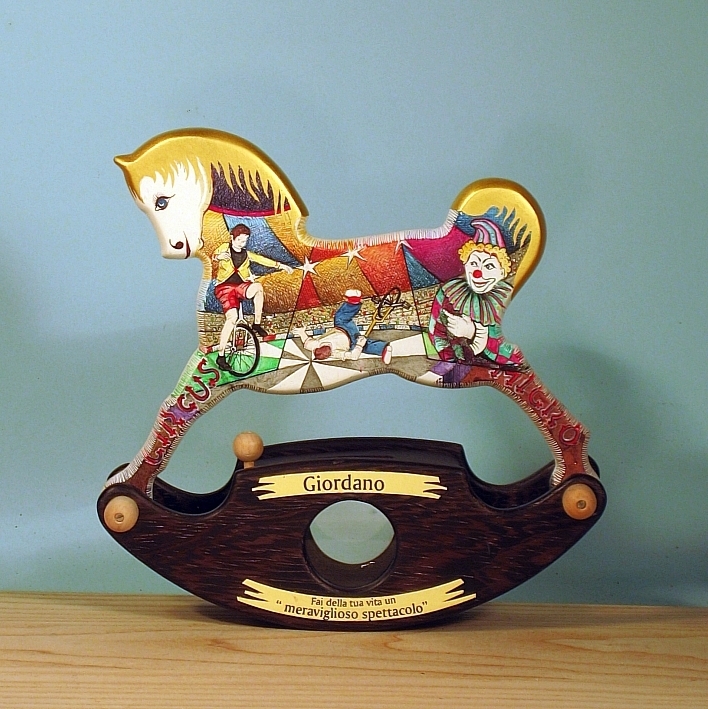 Giocattoli d'arte da collezione, realizzati con legni pregiati, dipinti ad acquerello variamente diluito e tampone con finiture in foglia d'oro 22Kt. Sono tutti pezzi unici, numerati e catalogati, forniti di certificato di produzione firmato dall'artista e sigillati con logo in cera lacca. Ideali per il collezionista, per un regalo di prestigio, per l'arredamento, opere rivolte a bambini e ragazzi come forma educativa per avvicinarli all'arte. Collectible art toys made of precious wood, painted with watercolor and swab with 22Kt gold leaf finishes. They are all unique pieces, numbered and cataloged, provided with a production certificate signed by the artist and sealed with lacquer wax logo. Ideal for the collector, for a prestigious gift, for furnishings, works directed at children and teens as an educational form to bring them closer to art.