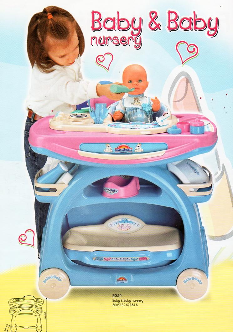 "BABY & BABY" giocattolo nursery con piano di lavoro intercambiabile, pappa, bagno e fasciatoio, corredato inoltre da molti accessori.